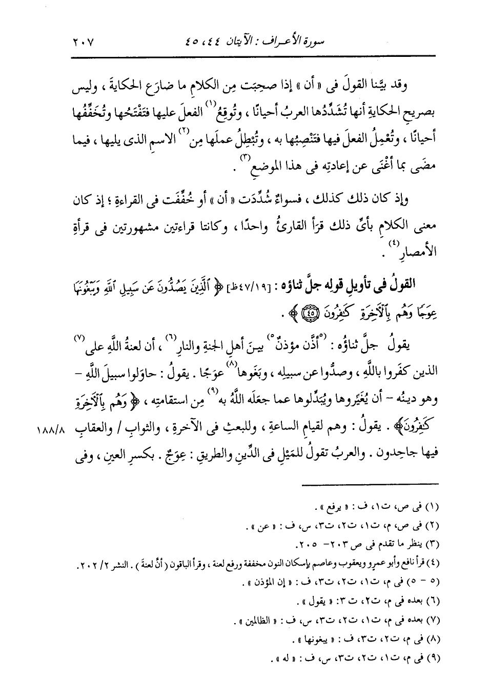 §الْقَوْلُ فِي تَأْوِيلِ قَوْلِهِ تَعَالَى: {الَّذِينَ يَصُدُّونَ عَنْ سَبِيلِ اللَّهِ وَيَبْغُونَهَا عِوَجًا وَهُمْ بِالْآخِرَةِ كَافِرُونَ} [الأعراف: 45] يَقُولُ جَلَّ ثَنَاؤُهُ: إِنَّ الْمُؤَذِّنَ بَيْنَ أَهْلِ الْجَنَّةِ وَالنَّارِ يَقُولُ: إِنَّ لَعْنَةَ اللَّهِ عَلَى الظَّالِمِينَ الَّذِينَ كَفَرُوا بِاللَّهِ وَصَدُّوا عَنْ سَبِيلِهِ. {وَيَبْغُونَهَا عِوَجًا} [الأعراف: 45] ، يَقُولُ: حَاوَلُوا سَبِيلَ اللَّهِ، وَهُوَ دِينُهُ، أَنْ يُغَيِّرُوهُ وَيُبَدِّلُوهُ عَمَّا جَعَلَهُ اللَّهُ لَهُ مِنِ اسْتِقَامَتِهِ. {وَهُمْ بِالْآخِرَةِ كَافِرُونَ} [الأعراف: 45] يَقُولُ: وَهُمْ لَقِيَامِ السَّاعَةِ وَالْبَعْثِ فِي الْآخِرَةِ وَالثَّوَابِ وَالْعِقَابِ فِيهَا جَاحِدُونَ. وَالْعَرَبُ تَقُولُ لِلْمَيْلِ فِي الدِّينِ وَالطَّرِيقِ: (عِوَجٌ) بِكَسْرِ الْعَيْنِ، وَفِي