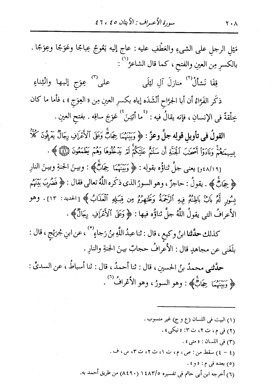 §الْقَوْلُ فِي تَأْوِيلِ قَوْلِهِ تَعَالَى: {وَبَيْنَهُمَا حِجَابٌ وَعَلَى الْأَعْرَافِ رِجَالٌ يَعْرِفُونَ كُلًّا بِسِيمَاهُمْ وَنَادَوْا أَصْحَابَ الْجَنَّةِ أَنْ سَلَامٌ عَلَيْكُمْ لَمْ يَدْخُلُوهَا وَهُمْ يَطْمَعُونَ} [الأعراف: 46] يَعْنِي جَلَّ ثَنَاؤُهُ بِقَوْلِهِ: {وَبَيْنَهُمَا حِجَابٌ} [الأعراف: 46] : وَبَيْنَ الْجَنَّةِ وَالنَّارِ حِجَابٌ، يَقُولُ: حَاجِزٌ، وَهُوَ السُّورُ الَّذِي ذَكَرَهُ اللَّهُ تَعَالَى فَقَالَ: {فَضُرِبَ بَيْنَهُمْ بِسُوَرٍ لَهُ بَابٌ بَاطِنُهُ فِيهِ الرَّحْمَةُ وَظَاهِرُهُ مِنْ قِبَلِهِ الْعَذَابُ} [الحديد: 13] ، وَهُوَ الْأَعْرَافُ الَّتِي يَقُولُ اللَّهُ فِيهَا: {وَعَلَى الْأَعْرَافِ رِجَالٌ} [الأعراف: 46]