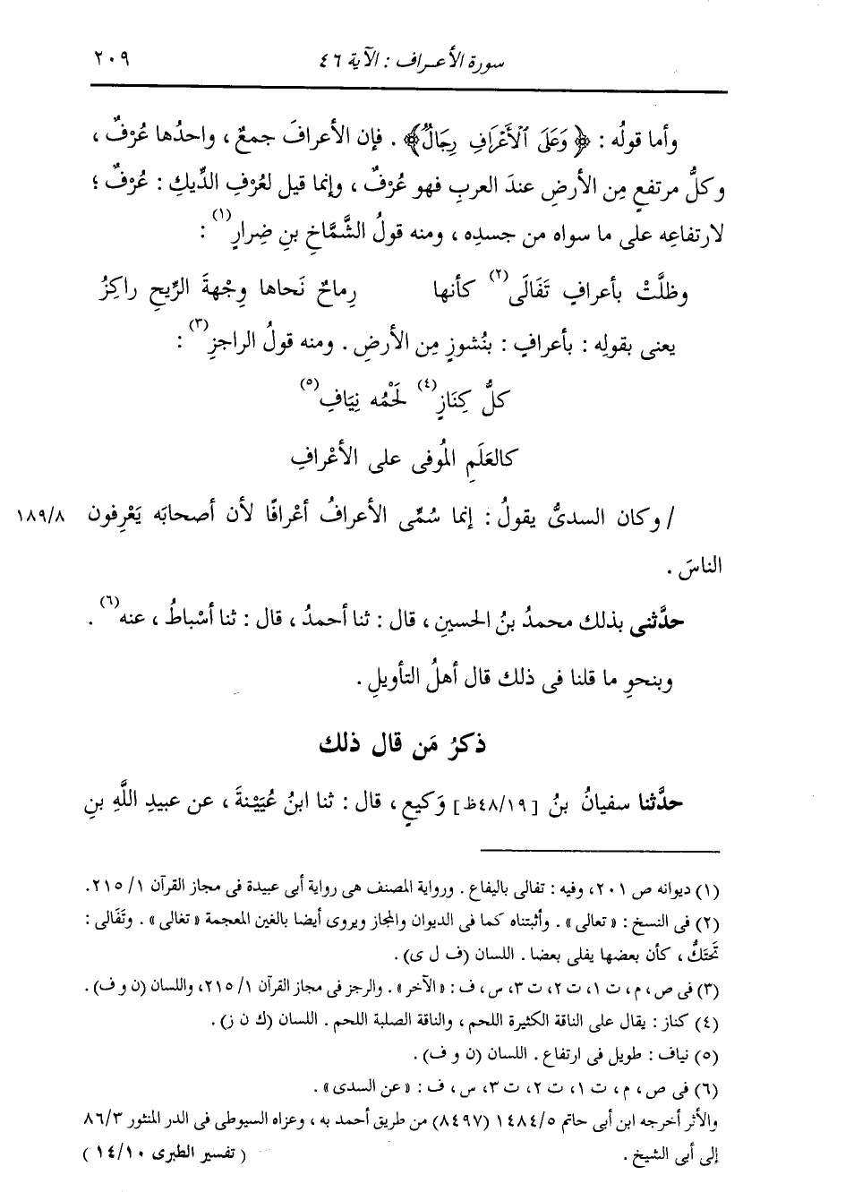 وَكَانَ السُّدِّيُّ يَقُولُ: «إِنَّمَا سُمِّيَ الْأَعْرَافُ أَعْرَافًا، §لِأَنَّ أَصْحَابَهُ يَعْرِفُونَ النَّاسَ» حَدَّثَنِي بِذَلِكَ، مُحَمَّدُ بْنُ الْحُسَيْنِ قَالَ: ثنا أَحْمَدُ بْنُ الْمُفَضَّلِ، قَالَ: ثنا أَسْبَاطٌ، عَنِ السُّدِّيِّ وَبِنَحْوِ الَّذِي قُلْنَا فِي ذَلِكَ قَالَ أَهْلُ التَّأْوِيلِ