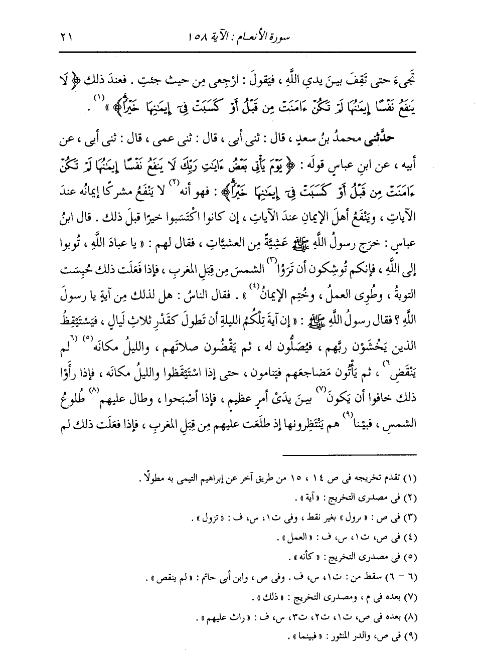 حَدَّثَنِي مُحَمَّدُ بْنُ سَعْدٍ، قَالَ: ثني أَبِي قَالَ: ثني عَمِّي قَالَ: ثني أَبِي، عَنْ أَبِيهِ، عَنِ ابْنِ عَبَّاسٍ، قَوْلُهُ: {§يَوْمَ يَأْتِي بَعْضُ آيَاتِ رَبِّكَ لَا يَنْفَعُ نَفْسًا إِيمَانُهَا لَمْ تَكُنْ آمَنَتْ مِنْ قَبْلُ أَوْ كَسَبَتْ فِي إِيمَانِهَا خَيْرًا} [الأنعام: 158] ، «فَهُوَ أَنَّهُ لَا يَنْفَعُ مُشْرِكًا إِيمَانُهُ عِنْدَ الْآيَاتِ، وَيَنْفَعُ أَهْلَ الْإِيمَانِ عِنْدَ الْآيَاتِ إِنْ كَانُوا اكْتَسَبُوا خَيْرًا قَبْلَ ذَلِكَ»