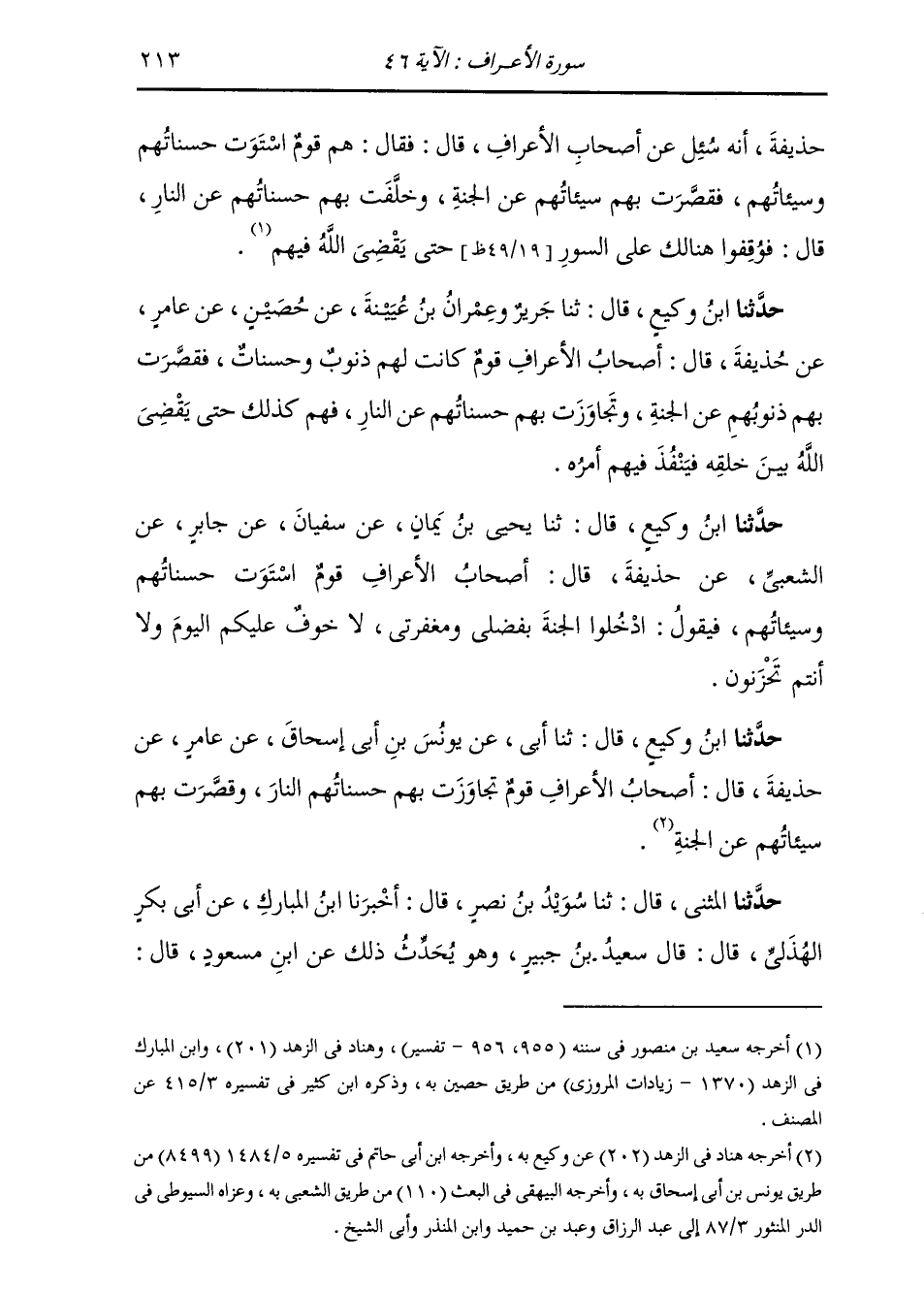 حَدَّثَنَا ابْنُ وَكِيعٍ قَالَ: ثنا جَرِيرٌ وَعِمْرَانُ بْنُ عُيَيْنَةَ، عَنْ حُصَيْنٍ، عَنْ عَامِرٍ، عَنْ حُذَيْفَةَ قَالَ: " أَصْحَابُ الْأَعْرَافِ: §قَوْمٌ كَانَتْ لَهُمْ ذُنُوبٌ وَحَسَنَاتٌ، فَقَصُرَتْ بِهِمْ ذُنُوبُهُمْ عَنِ الْجَنَّةِ وَتَجَاوَزَتْ بِهِمْ حَسَنَاتُهُمْ عَنِ النَّارِ، فَهُمْ كَذَلِكَ حَتَّى يَقْضِيَ اللَّهُ بَيْنَ خَلْقِهِ فَيَنْفُذُ فِيهِمْ أَمْرُهُ "