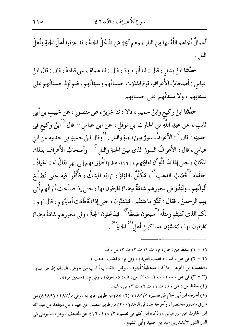 حَدَّثَنَا ابْنُ وَكِيعٍ، وَابْنُ حُمَيْدٍ، قَالَا: ثنا جَرِيرٌ، عَنْ مَنْصُورٍ، عَنْ حَبِيبِ بْنِ أَبِي ثَابِتٍ، عَنْ عَبْدِ اللَّهِ بْنِ الْحَارِثِ، عَنِ ابْنِ عَبَّاسٍ، قَالَ: " §الْأَعْرَافُ: سُورٌ بَيْنَ الْجَنَّةِ وَالنَّارِ، وَأَصْحَابُ الْأَعْرَافِ بِذَلِكَ الْمَكَانِ، حَتَّى إِذَا بَدَا لِلَّهِ أَنْ يُعَافِيَهُمْ، انْطَلَقَ بِهِمْ إِلَى نَهَرٍ يُقَالُ لَهُ الْحَيَاةُ، حَافَّتَاهُ قُضُبُ الذَّهَبِ مُكَلَّلٍ بِاللُّؤْلُؤِ، تُرَابُهُ الْمِسْكُ، فَأُلْقُوا فِيهِ حَتَّى تَصْلُحَ أَلْوَانُهُمْ وَيَبْدُو فِي نُحُورِهِمْ شَامَةٌ بَيْضَاءُ يُعْرَفُونَ بِهَا، حَتَّى إِذَا صَلَحَتْ أَلْوَانُهُمْ أَتَى بِهِمُ الرَّحْمَنُ، فَقَالَ: تَمَنَّوْا مَا شِئْتُمْ قَالَ: فَيَتَمَنَّوْنَ، حَتَّى إِذَا انْقَطَعَتْ أُمْنِيَتُهُمْ قَالَ لَهُمْ: لَكُمُ الَّذِي تَمَنَّيْتُمْ وَمِثْلُهُ سَبْعِينَ مَرَّةً. فَيَدْخُلُونَ الْجَنَّةَ وَفِي نُحُورِهِمْ شَامَةٌ بَيْضَاءُ يُعْرَفُونَ بِهَا، يُسَمَّوْنَ مَسَاكِينَ الْجَنَّةِ "