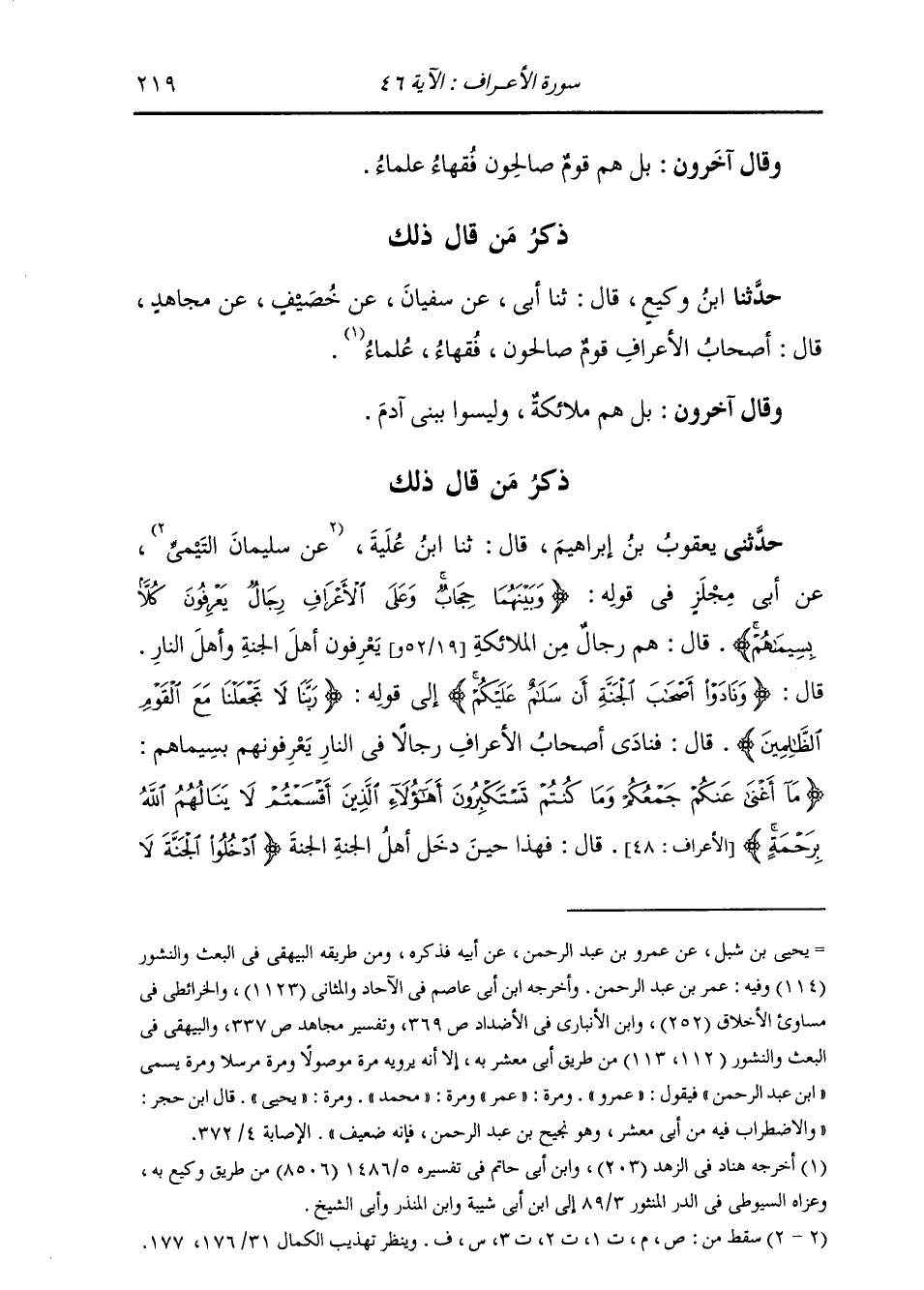 ذِكْرُ مَنْ قَالَ ذَلِكَ حَدَّثَنَا ابْنُ وَكِيعٍ، قَالَ: ثنا أَبِي، عَنْ سُفْيَانَ، عَنْ خُصَيْفٍ، عَنْ مُجَاهِدٍ، قَالَ: «§أَصْحَابُ الْأَعْرَافِ قَوْمٌ صَالِحُونَ فُقَهَاءُ عُلَمَاءُ» وَقَالَ آخَرُونَ: بَلْ هُمْ مَلَائِكَةٌ، وَلَيْسُوا بِبَنِي آدَمَ