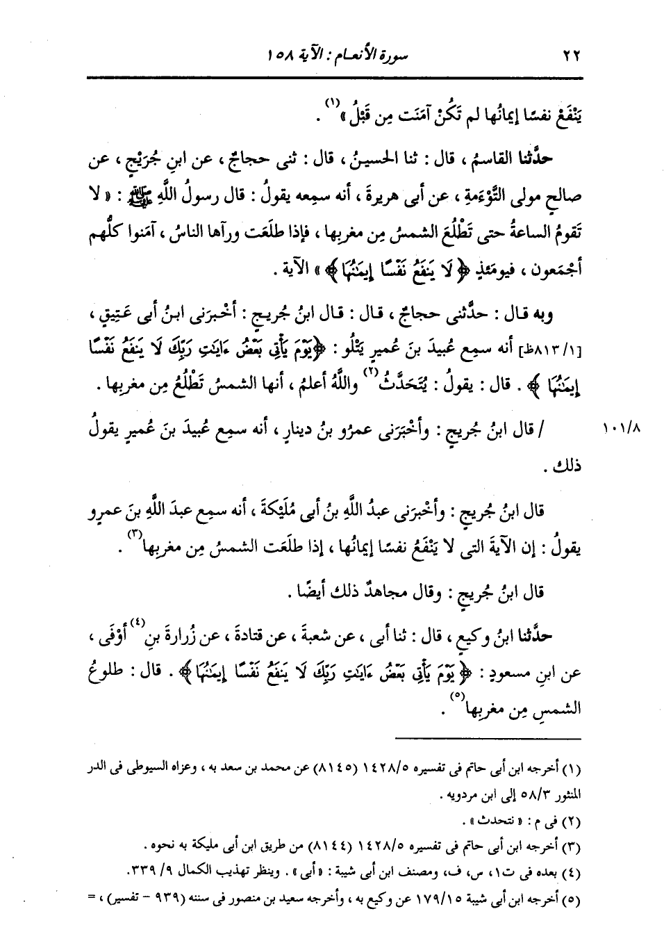 حَدَّثَنَا الْقَاسِمُ قَالَ: ثنا الْحُسَيْنُ قَالَ: ثني حَجَّاجٌ، عَنِ ابْنِ جُرَيْجٍ، عَنْ صَالِحٍ مَوْلَى التَّوْأَمَةِ، عَنْ أَبِي هُرَيْرَةَ أَنَّهُ سَمِعَهُ يَقُولُ: قَالَ رَسُولُ اللَّهِ صَلَّى اللهُ عَلَيْهِ وَسَلَّمَ: «§لَا تَقُومُ السَّاعَةُ حَتَّى تَطْلُعَ الشَّمْسُ مِنْ مَغْرِبِهَا، فَإِذَا طَلَعَتْ وَرَآهَا النَّاسُ آمَنُوا كُلُّهُمْ أَجْمَعُونَ، فَيَوْمَئِذٍ لَا يَنْفَعُ نَفْسًا إِيمَانُهَا» الْآيَةَ