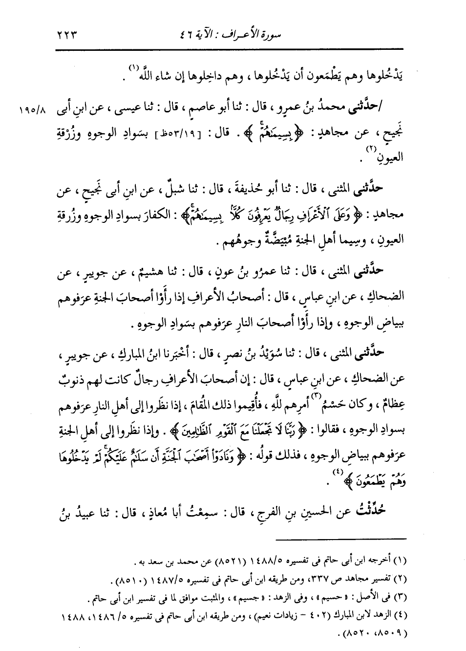 حَدَّثَنِي الْمُثَنَّى قَالَ: ثنا عَمْرُو بْنُ عَوْنٍ قَالَ: ثنا هُشَيْمٌ، عَنْ جُوَيْبِرٍ، عَنِ الضَّحَّاكِ، عَنِ ابْنِ عَبَّاسٍ قَالَ: «أَصْحَابُ الْأَعْرَافِ §إِذَا رَأَوْا أَصْحَابَ الْجَنَّةِ عَرَفُوهُمْ بِبَيَاضِ الْوُجُوهِ، وَإِذَا رَأَوْا أَصْحَابَ النَّارِ عَرَفُوهُمْ بِسَوَادِ الْوُجُوهِ»