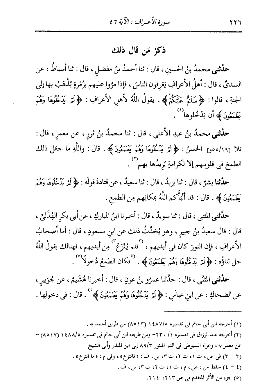حَدَّثَنِي مُحَمَّدُ بْنُ عَبْدِ الْأَعْلَى، قَالَ: ثنا مُحَمَّدُ بْنُ ثَوْرٍ، عَنْ مَعْمَرٍ، قَالَ: تَلَا الْحَسَنُ: {لَمْ يَدْخُلُوهَا وَهُمْ يَطْمَعُونَ} [الأعراف: 46] ، قَالَ: «§وَاللَّهِ مَا جُعِلَ ذَلِكَ الطَّمَعُ فِي قُلُوبِهِمْ إِلَّا لِكَرَامَةٍ يُرِيدُهَا بِهِمْ»