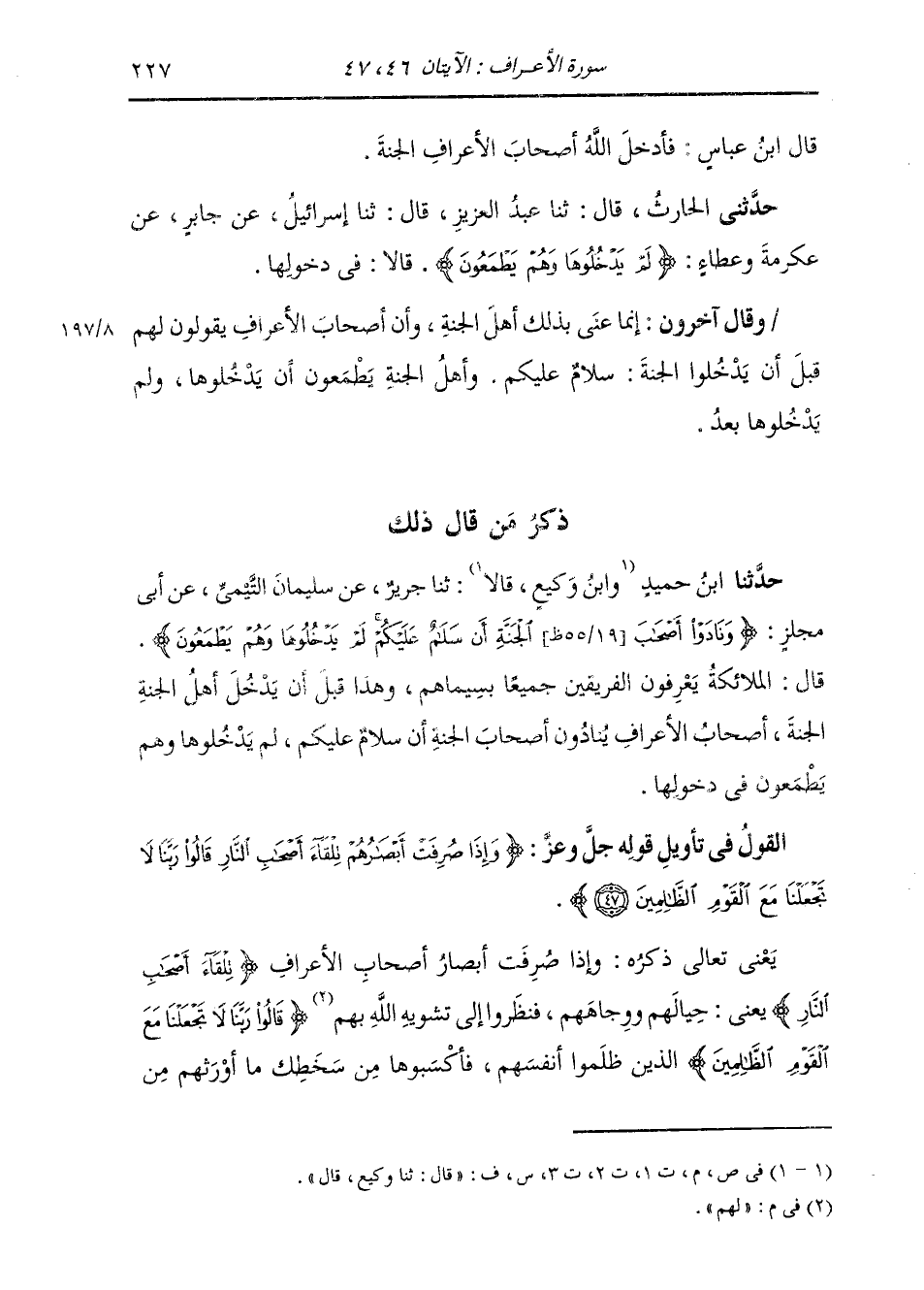 حَدَّثَنِي الْحَرْثُ، قَالَ: ثنا عَبْدُ الْعَزِيزِ، قَالَ: ثنا إِسْرَائِيلُ، عَنْ جَابِرٍ، عَنْ عِكْرِمَةَ، وَعَطَاءٍ: {§لَمْ يَدْخُلُوهَا وَهُمْ يَطْمَعُونَ} [الأعراف: 46] ، قَالَا: «فِي دُخُولِهَا» وَقَالَ آخَرُونَ: إِنَّمَا عُنِيَ بِذَلِكَ أَهْلُ الْجَنَّةِ، وَأَنَّ أَصْحَابَ الْأَعْرَافِ يَقُولُونَ لَهُمْ قَبْلَ أَنْ يَدْخُلُوا الْجَنَّةَ: سَلَامٌ عَلَيْكُمْ، وَأَهْلُ الْجَنَّةِ يَطْمَعُونَ أَنْ يَدْخُلُوهَا، وَلَمْ يَدْخُلُوهَا بَعْدُ