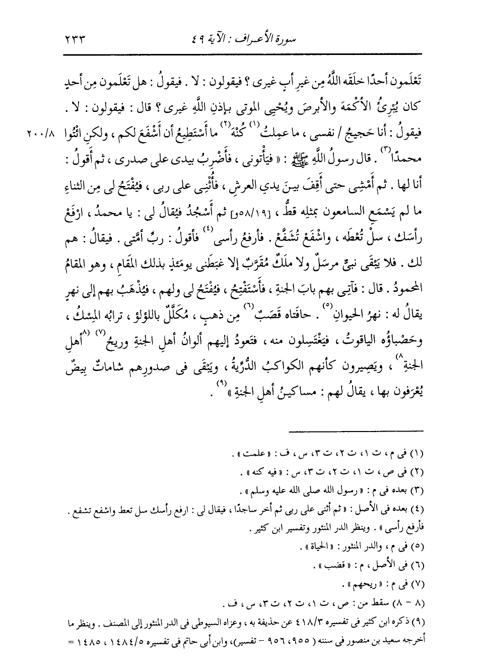 تَعْلَمُونَ أَحَدًا خَلَقَهُ اللَّهُ مِنْ غَيْرِ أَبٍ غَيْرِي؟ فَيَقُولُونَ: لَا، فَيَقُولُ: هَلْ تَعْلَمُونَ مِنْ أَحَدٍ كَانَ يُبْرِئُ الْأَكْمَهَ وَالْأَبْرَصَ وَيُحْيِي الْمَوْتَى بِإِذْنِ اللَّهِ غَيْرِي؟ قَالَ: فَيَقُولُونَ: لَا، قَالَ: فَيَقُولُ: أَنَا حَجِيجُ نَفْسِي، مَا عَلِمْتُ كُنْهَ مَا أَسْتَطِيعُ أَنْ أَشْفَعَ لَكُمْ، وَلَكِنِ ائْتُوا مُحَمَّدًا رَسُولَ اللَّهِ صَلَّى اللهُ عَلَيْهِ وَسَلَّمَ، قَالَ رَسُولُ اللَّهِ صَلَّى اللهُ عَلَيْهِ وَسَلَّمَ: " فَيَأْتُونِي، §فَأَضْرِبُ بِيَدِي عَلَى صَدْرِي ثُمَّ أَقُولُ: أَنَا لَهَا. ثُمَّ أَمْشِي حَتَّى أَقِفَ بَيْنَ يَدَيِ الْعَرْشِ، فَأُثْنِي عَلَى رَبِّي، فَيَفْتَحُ لِي مِنَ الثَّنَاءِ مَا لَمْ يَسْمَعِ السَّامِعُونَ بِمِثْلِهِ قَطُّ، ثُمَّ أَسْجُدُ فَيُقَالُ لِي: يَا مُحَمَّدُ، ارْفَعْ رَأْسَكَ، سَلْ تُعْطَهْ، وَاشْفَعْ تُشَفَّعْ. فَأَرْفَعُ رَأْسِي فَأَقُولُ: رَبِّ أُمَّتِي، فَيُقَالُ: هُمْ لَكَ. فَلَا يَبْقَى نَبِيُّ مُرْسَلٌ وَلَا مَلَكٌ مُقَرَّبٌ إِلَّا غَبَطَنِي يَوْمَئِذٍ بِذَلِكَ الْمَقَامِ، وَهُوَ الْمَقَامُ الْمَحْمُودُ ". قَالَ: «فَآتِي بِهِمْ بَابَ الْجَنَّةِ فَأَسْتَفْتِحُ، فَيُفْتَحُ لِي وَلَهُمْ، فَيُذْهَبُ بِهِمْ إِلَى نَهَرٍ يُقَالُ لَهُ نَهَرُ الْحَيَاةِ، حَافَّتَاهُ قُضُبٌ مِنْ ذَهَبٍ مُكَلَّلٍ بِاللُّؤْلُؤِ، تُرَابُهُ الْمِسْكُ، وَحَصْبَاؤُهُ الْيَاقُوتُ، فَيَغْتَسِلُونَ مِنْهُ، فَتَعُودُ إِلَيْهِمْ أَلْوَانُ أَهْلِ الْجَنَّةِ وَرِيحُهُمْ، وَيَصِيرُونَ كَأَنَّهُمُ الْكَوَاكِبُ الدُّرِّيَّةُ، وَيَبْقَى فِي صَدْرِهِمْ شَامَاتٌ بِيضٌ يُعْرَفُونَ بِهَا، يُقَالُ لَهُمْ مَسَاكِينُ أَهْلِ الْجَنَّةِ»