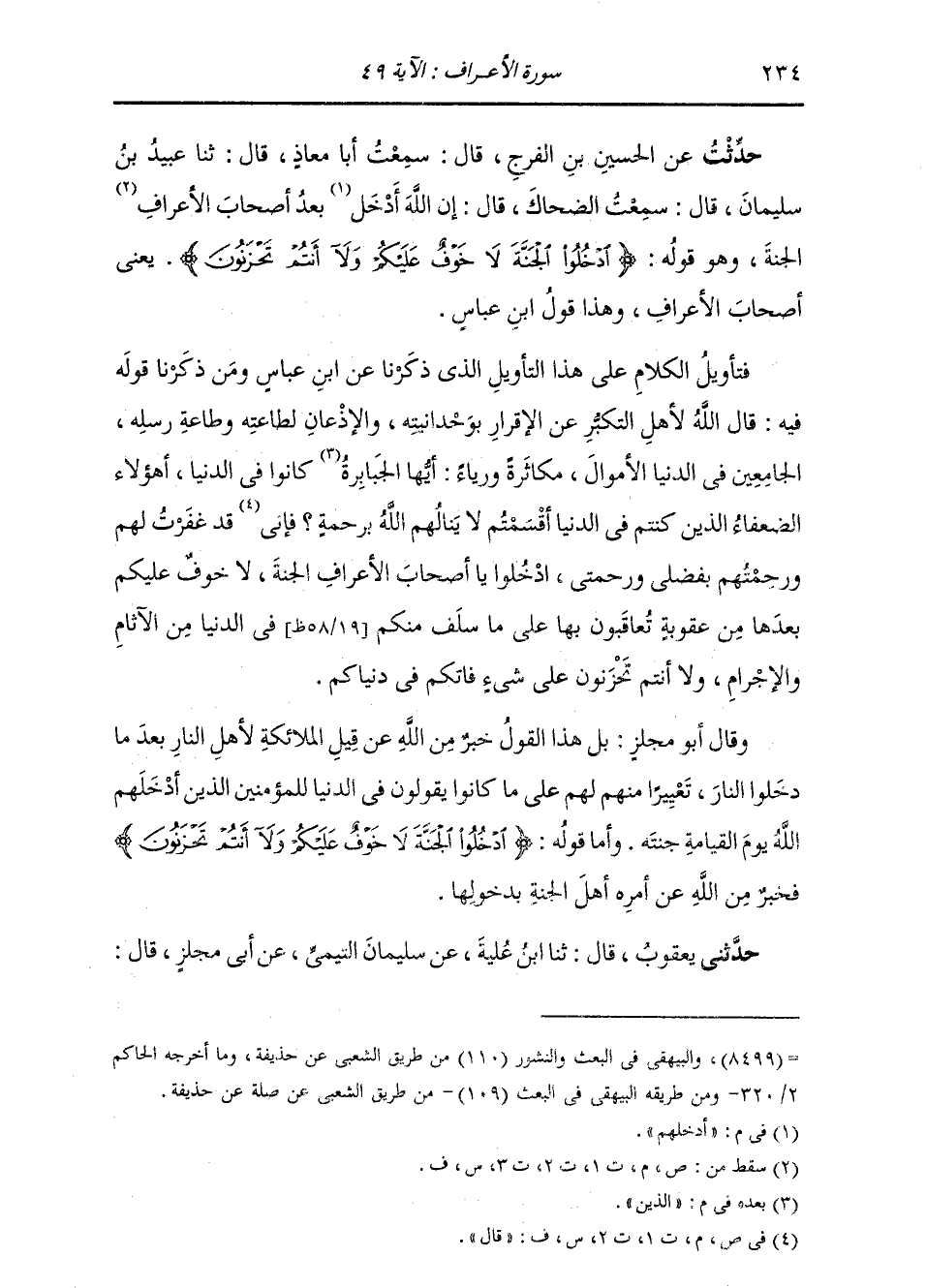 حُدِّثْتُ عَنِ الْحُسَيْنِ بْنِ الْفَرَجِ، قَالَ: سَمِعْتُ أَبَا مُعَاذٍ، قَالَ: ثنا عُبَيْدُ بْنُ سُلَيْمَانَ، قَالَ: سَمِعْتُ الضَّحَّاكَ، قَالَ: " إِنَّ اللَّهَ §أَدْخَلَهُمْ بَعْدَ أَصْحَابِ الْجَنَّةِ، وَهُوَ قَوْلُهُ: {ادْخُلُوا الْجَنَّةَ لَا خَوْفٌ عَلَيْكُمْ وَلَا أَنْتُمْ تَحْزَنُونَ} [الأعراف: 49] ، يَعْنِي أَصْحَابَ الْأَعْرَافِ. وَهَذَا قَوْلُ ابْنِ عَبَّاسٍ فَتَأْوِيلُ الْكَلَامِ عَلَى هَذَا التَّأْوِيلِ الَّذِي ذَكَرْنَا عَنِ ابْنِ عَبَّاسٍ، وَمَنْ ذَكَرْنَا قَوْلَهُ فِيهِ: قَالَ اللَّهُ لِأَهْلِ التَّكَبُّرِ عَنِ الْإِقْرَارِ بِوَحْدَانِيَّةِ اللَّهِ وَالْإِذْعَانِ لِطَاعَتِهِ وَطَاعَةِ رُسُلِهِ الْجَامِعِينَ فِي الدُّنْيَا الْأَمْوَالَ مُكَاثَرَةً وَرِيَاءً: أَيُّهَا الْجَبَابِرَةُ الَّذِينَ كَانُوا فِي الدُّنْيَا، أَهَؤُلَاءِ الضُّعَفَاءُ الَّذِينَ كُنْتُمْ فِي الدُّنْيَا أَقْسَمْتُمْ لَا يَنَالُهُمُ اللَّهُ بِرَحْمَةٍ؟ قَالَ: قَدْ غَفَرْتُ لَهُمْ وَرَحَمْتُهُمْ بِفَضْلِي وَرَحْمَتِي، ادْخُلُوا يَا أَصْحَابَ الْأَعْرَافِ الْجَنَّةَ، لَا خَوْفٌ عَلَيْكُمْ بَعْدَهَا مِنْ عُقُوبَةٍ تُعَاقَبُونَ بِهَا عَلَى مَا سَلَفَ مِنْكُمْ فِي الدُّنْيَا مِنَ الْآثَامِ وَالْإِجْرَامِ، وَلَا أَنْتُمْ تَحْزَنُونَ عَلَى شَيْءٍ فَاتَكُمْ فِي دُنْيَاكُمْ وَقَالَ أَبُو مِجْلَزٍ: بَلْ هَذَا الْقَوْلُ خَبَرٌ مِنَ اللَّهِ عَنْ قِيلِ الْمَلَائِكَةِ لِأَهْلِ النَّارِ بَعْدَمَا دَخَلُوا النَّارَ تَعْيِيرًا مِنْهُمْ لَهُمْ عَلَى مَا كَانُوا يَقُولُونَ فِي الدُّنْيَا لِلْمُؤْمِنِينَ الَّذِينَ أَدْخَلَهُمُ اللَّهُ يَوْمَ الْقِيَامَةِ جَنَّتَهُ. وَأَمَّا قَوْلُهُ: {ادْخُلُوا الْجَنَّةَ لَا خَوْفٌ عَلَيْكُمْ وَلَا أَنْتُمْ تَحْزَنُونَ} [الأعراف: 49] ، فَخَبَرٌ مِنَ اللَّهِ عَنْ أَمْرِهِ أَهْلَ الْجَنَّةِ بِدُخُولِهَا