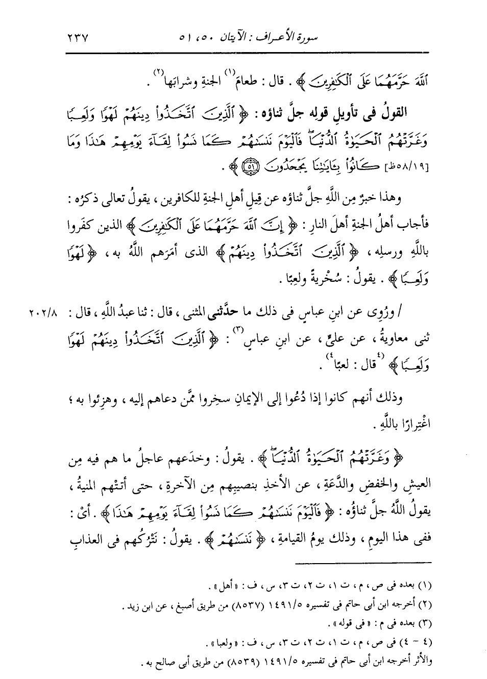 §الْقَوْلُ فِي تَأْوِيلِ قَوْلِهِ تَعَالَى: {الَّذِينَ اتَّخَذُوا دِينَهُمْ لَهْوًا وَلَعِبًا وَغَرَّتْهُمُ الْحَيَاةُ الدُّنْيَا فَالْيَوْمَ نَنْسَاهُمْ كَمَا نَسُوا لِقَاءَ يَوْمِهِمْ هَذَا وَمَا كَانُوا بِآيَاتِنَا يَجْحَدُونَ} [الأعراف: 51] وَهَذَا خَبَرٌ مِنَ اللَّهِ عَنْ قِيلِ أَهْلِ الْجَنَّةِ لِلْكَافِرِينَ، يَقُولُ تَعَالَى ذِكْرُهُ: فَأَجَابَ أَهْلُ الْجَنَّةِ أَهْلَ النَّارِ: {إِنَّ اللَّهَ حَرَّمَهُمَا عَلَى الْكَافِرِينَ} [الأعراف: 50] الَّذِينَ كَفَرُوا بِاللَّهِ وَرُسُلِهِ، {الَّذِينَ اتَّخَذُوا دِينَهُمْ} [الأنعام: 70] الَّذِي أَمَرَهُمُ اللَّهُ بِهِ {لَهْوًا وَلَعِبًا} [الأعراف: 51] ، يَقُولُ: سُخْرِيَةً وَلَعِبًا وَرُوِيَ عَنِ ابْنِ عَبَّاسٍ فِي ذَلِكَ