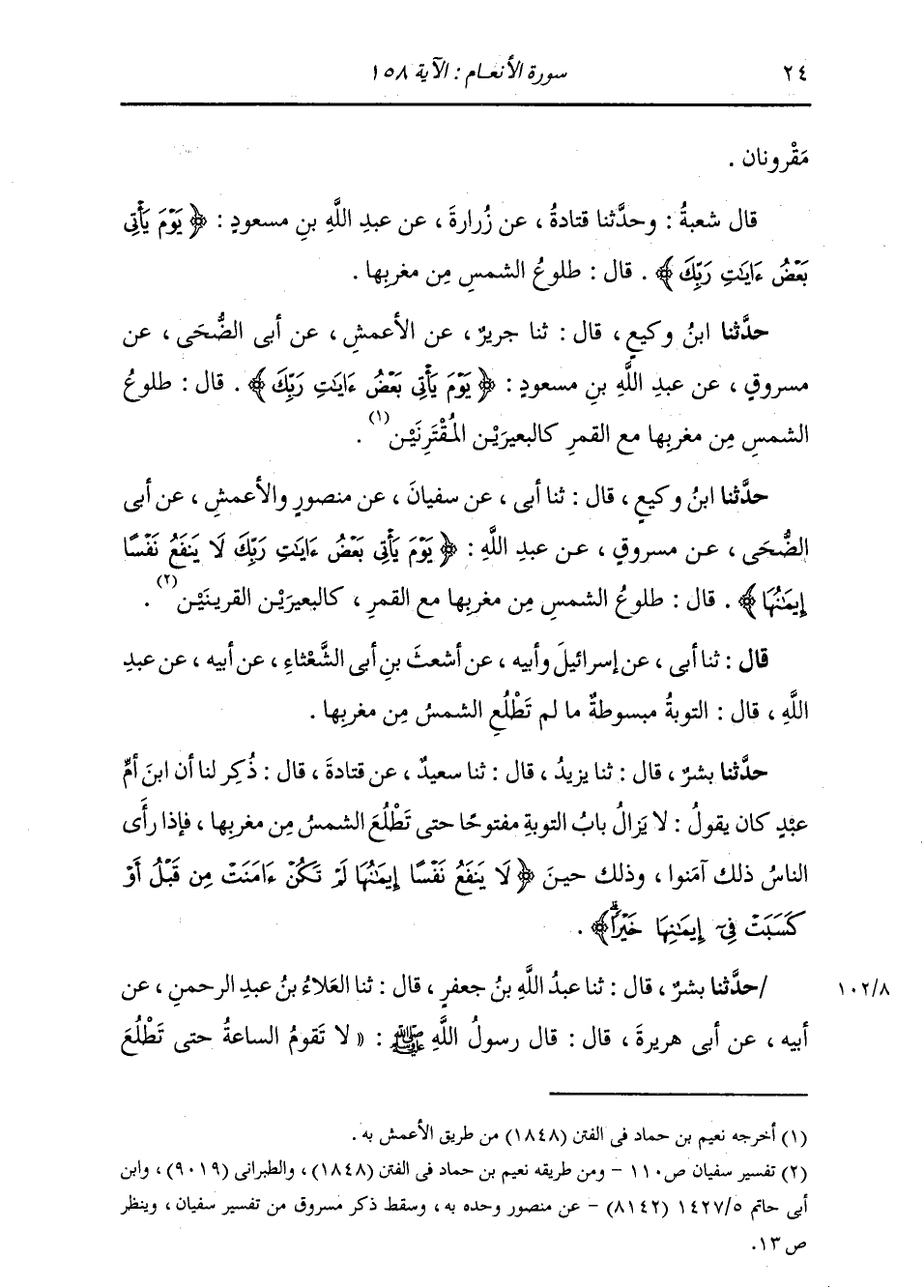 حَدَّثَنَا ابْنُ وَكِيعٍ قَالَ: ثنا أَبِي، عَنْ سُفْيَانَ، عَنْ مَنْصُورٍ وَالْأَعْمَشِ، عَنْ أَبِي الضُّحَى، عَنْ مَسْرُوقٍ، عَنْ عَبْدِ اللَّهِ: {يَوْمَ يَأْتِي بَعْضُ آيَاتِ رَبِّكَ لَا يَنْفَعُ نَفْسًا إِيمَانُهَا} [الأنعام: 158] قَالَ: «§طُلُوعُ الشَّمْسِ مِنْ مَغْرِبِهَا مَعَ الْقَمَرِ كَالْبَعِيرَيْنِ الْقَرِينَيْنِ»