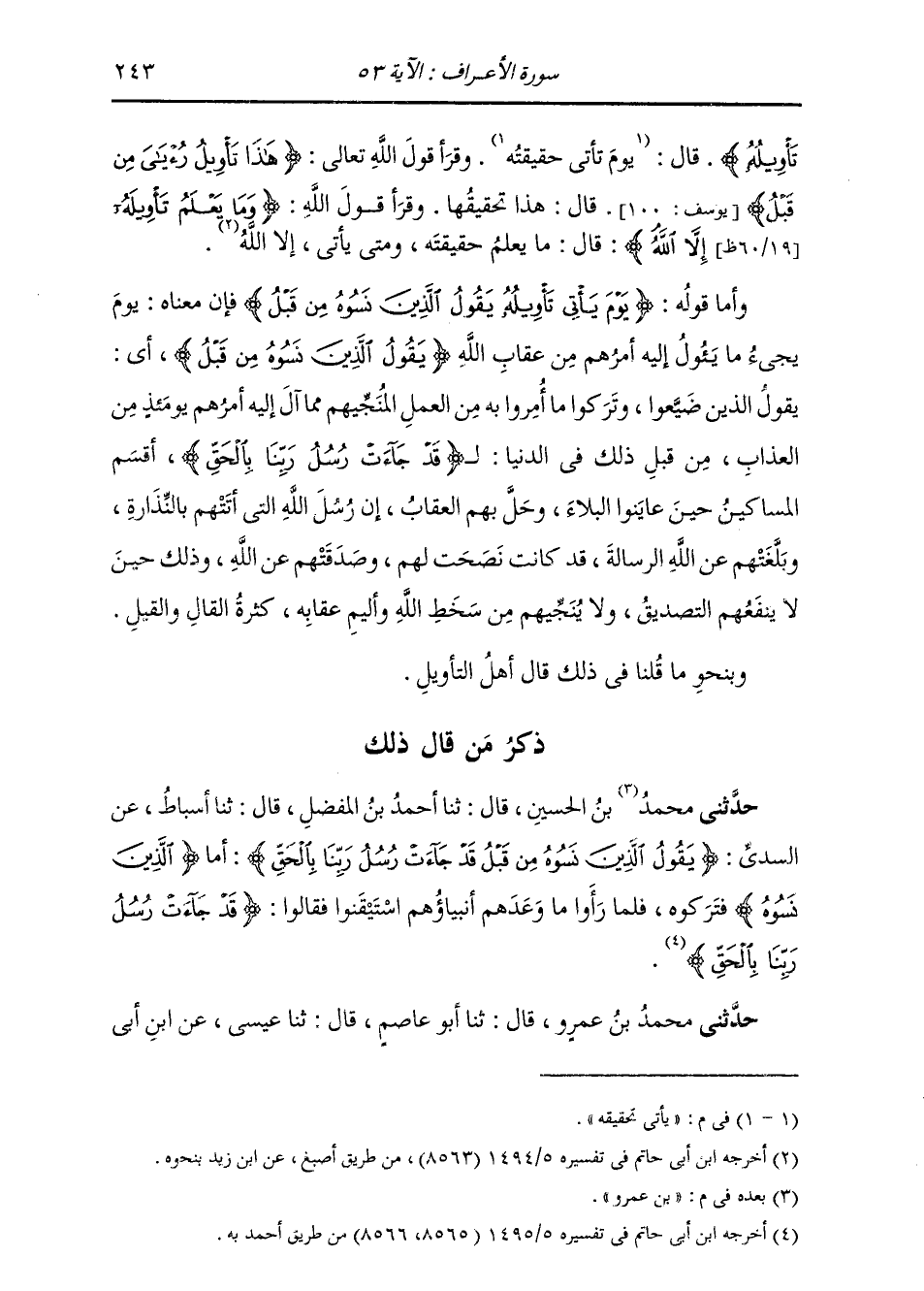 §وَأَمَّا قَوْلُهُ: {يَوْمَ يَأْتِي تَأْوِيلُهُ يَقُولُ الَّذِينَ نَسُوهُ مِنْ قَبْلُ} [الأعراف: 53] ، فَإِنَّ مَعْنَاهُ: يَوْمَ يَجِيءُ مَا يَئُولُ إِلَيْهِ أَمْرُهُمْ مِنْ عِقَابِ اللَّهِ، {يَقُولُ الَّذِينَ نَسُوهُ مِنْ قَبْلُ} [الأعراف: 53] ، أَيْ يَقُولُ الَّذِينَ ضَيَّعُوا وَتَرَكُوا مَا أُمِرُوا بِهِ مِنَ الْعَمَلِ الْمُنَجِّيهِمْ مِمَّا آلَ إِلَيْهِ أَمْرُهُمْ يَوْمَئِذٍ مِنَ الْعَذَابِ مِنْ قَبْلُ ذَلِكَ فِي الدُّنْيَا: {قَدْ جَاءَتْ رُسُلُ رَبِّنَا بِالْحَقِّ} [الأعراف: 53] ، أَقْسَمَ الْمَسَاكِينُ حِينَ عَايَنُوا الْبَلَاءَ وَحَلَّ بِهِمُ الْعِقَابُ أَنَّ رُسُلَ اللَّهِ الَّتِي أَتَتَّهِمُ بِالنِّذَارَةِ وَبَلَّغَتْهُمْ عَنِ اللَّهِ الرِّسَالَةَ، قَدْ كَانَتْ نَصَحَتْ لَهُمْ وَصَدَّقَتْهُمْ عَنِ اللَّهِ، وَذَلِكَ حِينَ لَا يَنْفَعُهُمُ التَّصْدِيقُ وَلَا يُنَجِّيهِمْ مِنْ سَخَطِ اللَّهِ وَأَلِيمِ عِقَابِهِ كَثْرَةُ الْقِيلِ وَالْقَالِ. وَبِنَحْوِ الَّذِي قُلْنَا فِي ذَلِكَ قَالَ أَهْلُ التَّأْوِيلِ