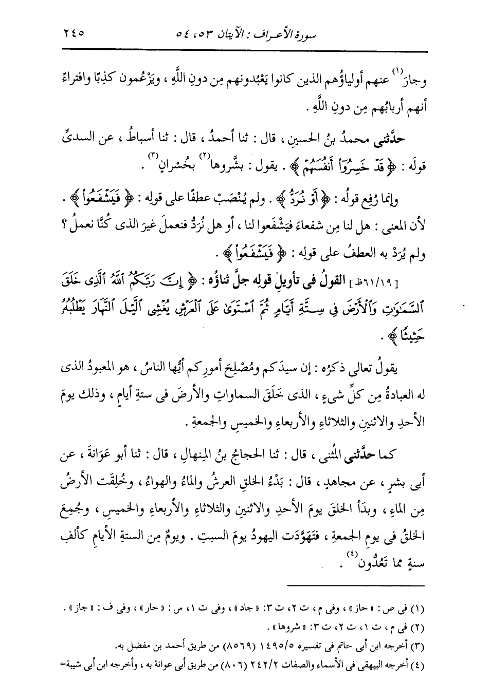 §الْقَوْلُ فِي تَأْوِيلِ قَوْلِهِ تَعَالَى: {إِنَّ رَبَّكُمُ اللَّهُ الَّذِي خَلَقَ السَّمَوَاتِ وَالْأَرْضَ فِي سِتَّةِ أَيَّامٍ ثُمَّ اسْتَوَى عَلَى الْعَرْشِ يُغْشِي اللَّيْلَ النَّهَارَ يَطْلُبُهُ حَثِيثًا وَالشَّمْسَ وَالْقَمَرَ وَالنُّجُومَ مُسَخَّرَاتٍ بِأَمْرِهِ أَلَا لَهُ الْخَلْقُ وَالْأَمْرُ تَبَارَكَ اللَّهُ رَبُّ الْعَالَمِينَ} يَقُولُ تَعَالَى ذِكْرُهُ: إِنَّ سَيِّدَكُمْ وَمُصْلِحَ أُمُورِكُمْ أَيُّهَا النَّاسُ، هُوَ الْمَعْبُودُ الَّذِي لَهُ الْعِبَادَةُ مِنْ كُلِّ شَيْءٍ، الَّذِي خَلَقَ السَّمَوَاتِ وَالْأَرْضَ فِي سِتَّةِ أَيَّامٍ، وَذَلِكَ يَوْمُ الْأَحَدِ وَالِاثْنَيْنِ وَالثُّلَاثَاءِ وَالْأَرْبِعَاءِ وَالْخَمِيسِ وَالْجُمُعَةِ