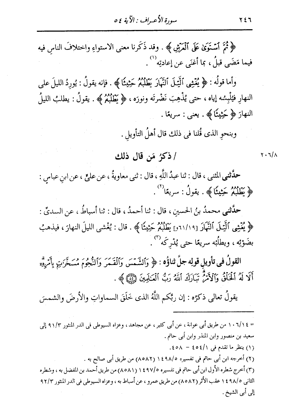 ذِكْرُ مَنْ قَالَ ذَلِكَ حَدَّثَنِي الْمُثَنَّى، قَالَ: ثنا عَبْدُ اللَّهِ بْنُ صَالِحٍ، قَالَ: ثني مُعَاوِيَةُ، عَنْ عَلِيِّ بْنِ أَبِي طَلْحَةَ، عَنِ ابْنِ عَبَّاسٍ: {§يَطْلُبُهُ حَثِيثًا} [الأعراف: 54] يَقُولُ: «سَرِيعًا»