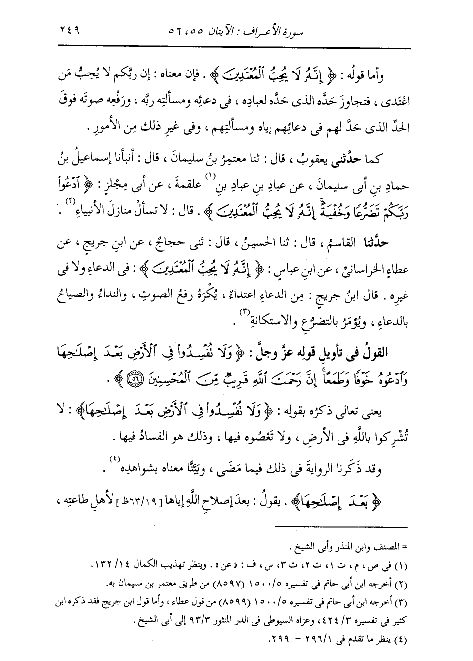 حَدَّثَنِي الْقَاسِمُ، قَالَ: ثنا الْحُسَيْنُ، قَالَ: ثني حَجَّاجٌ، عَنِ ابْنِ جُرَيْجٍ، عَنْ عَطَاءٍ الْخُرَاسَانِيِّ، عَنِ ابْنِ عَبَّاسٍ: {§إِنَّهُ لَا يُحِبُّ الْمُعْتَدِينَ} [الأعراف: 55] " فِي الدُّعَاءِ وَلَا فِي غَيْرِهِ قَالَ ابْنُ جُرَيْجٍ: «إِنَّ مِنَ الدُّعَاءِ اعْتِدَاءٌ، يُكْرَهُ رَفْعُ الصَّوْتِ وَالنِّدَاءُ وَالصِّيَاحُ بِالدُّعَاءِ، وَيُؤْمَرُ بِالتَّضَرُّعِ وَالِاسْتِكَانَةِ»