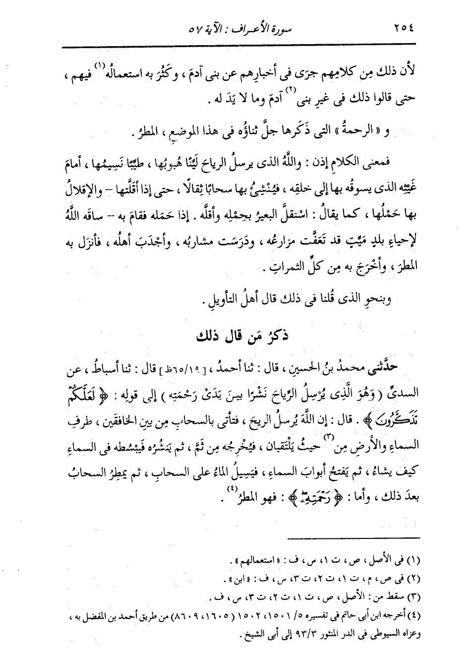 ذِكْرُ مَنْ قَالَ ذَلِكَ حَدَّثَنِي مُحَمَّدُ بْنُ الْحُسَيْنِ، قَالَ: ثنا أَحْمَدُ بْنُ الْمُفَضَّلِ، قَالَ: ثنا أَسْبَاطٌ، عَنِ السُّدِّيِّ: (وَهُو الَّذِي يُرْسِلُ الرِّيَاحَ نُشُرًا بَيْنَ يَدَيْ رَحْمَتِهِ) إِلَى قَوْلِهِ: {لَعَلَّكُمْ تَذَكَّرُونَ} [الأعراف: 57] قَالَ: " إِنَّ اللَّهَ §يُرْسِلُ الرِّيحَ فَتَأْتِي بِالسَّحَابِ مِنْ بَيْنِ الْخَافِقَيْنِ طَرَفِ السَّمَاءِ وَالْأَرْضِ مِنْ حَيْثُ يَلْتَقِيَانِ، فَيُخْرِجُهُ مِنْ ثَمَّ، ثُمَّ يَنْشُرُهُ فَيَبْسُطُهُ فِي السَّمَاءِ كَيْفَ يَشَاءُ، ثُمَّ يَفْتَحُ أَبْوَابَ السَّمَاءِ، فَيَسِيلُ الْمَاءُ عَلَى السَّحَابِ، ثُمَّ يُمْطِرُ السَّحَابُ بَعْدَ ذَلِكَ. وَأَمَّا رَحْمَتُهُ: فَهُوَ الْمَطَرُ "