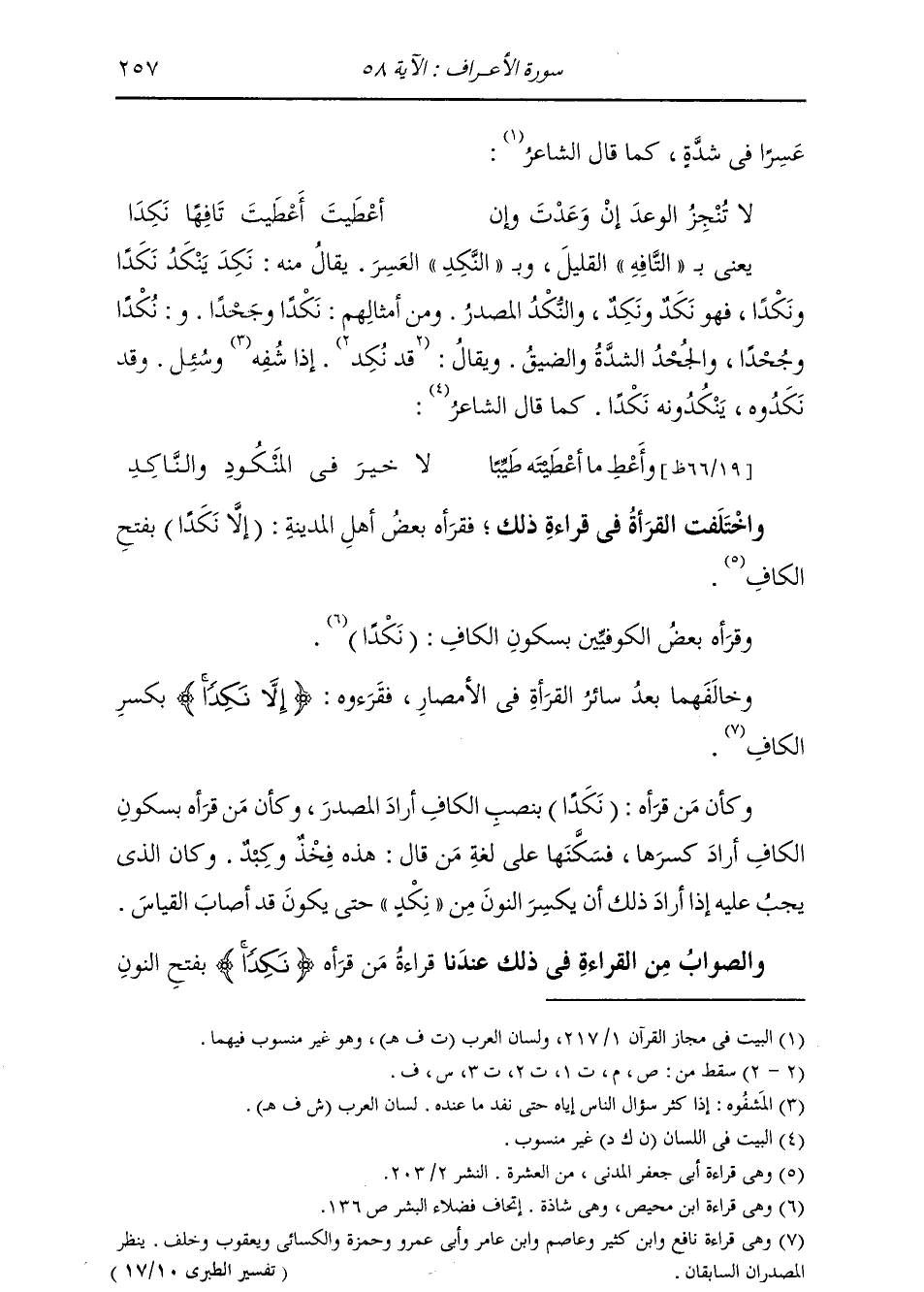 وَاخْتَلَفَتِ الْقُرَّاءُ فِي قِرَاءَةِ ذَلِكَ، فَقَرَأَهُ بَعْضُ أَهْلِ الْمَدِينَةِ: (إِلَّا نَكَدًا) بِفَتْحِ الْكَافِ. وَقَرَأَهُ بَعْضُ الْكُوفِيِّينَ بِسُكُونِ الْكَافِ: (نَكْدًا) . وَخَالَفَهُمَا بَعْضُ سَائِرِ الْقُرَّاءِ فِي الْأَمْصَارِ، فَقَرَءُوهُ: {إِلَّا نَكِدًا} [الأعراف: 58] بِكَسْرِ الْكَافِ. كَأَنَّ مَنْ قَرَأَهُ: (نَكَدًا) بِنَصْبِ الْكَافِ أَرَادَ الْمَصْدَرَ، وَكَأَنَّ مَنْ قَرَأَهُ بِسُكُونِ الْكَافِ أَرَادَ كَسْرَهَا فَسَكَّنَهَا عَلَى لُغَةِ مَنْ قَالَ: هَذِهِ فَخْذٌ وَكَتْدٌ، وَكَانَ الَّذِي يَجِبُ عَلَيْهِ إِذَا أَرَادَ ذَلِكَ أَنْ يكْسَرَ النُّونَ مِنْ (نَكْدٍ) حَتَّى يَكُونَ قَدْ أَصَابَ الْقِيَاسَ. قَالَ أَبُو جَعْفَرٍ: وَالصَّوَابُ مِنَ الْقِرَاءَةِ فِي ذَلِكَ عِنْدَنَا قِرَاءَةُ مَنْ قَرَأَهُ: {نَكِدًا} [الأعراف: 58] بِفَتْحِ النُّونِ