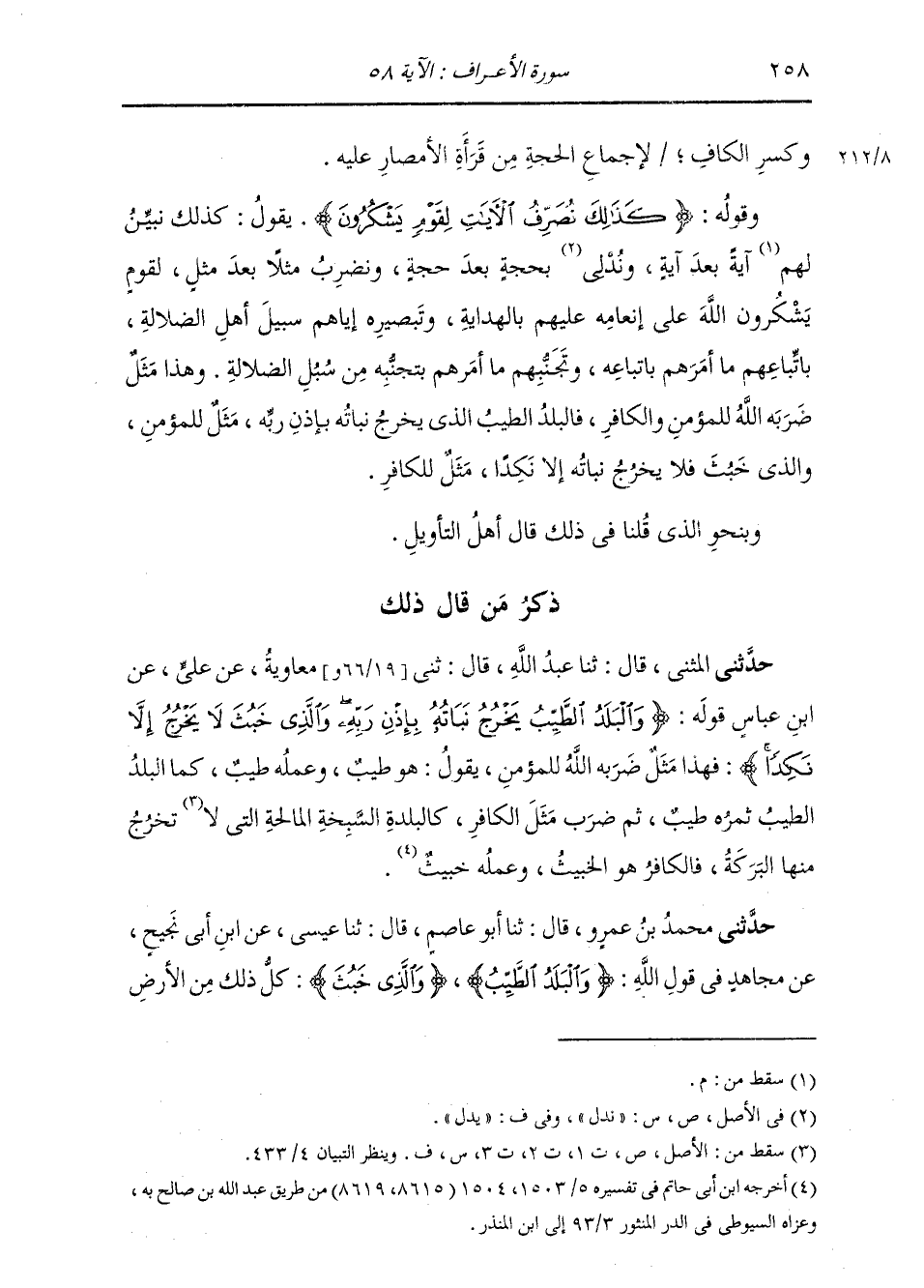 وَكَسْرِ الْكَافِ لِإِجْمَاعِ الْحُجَّةِ مِنْ قُرَّاءِ الْأَمْصَارِ عَلَيْهِ. وَقَوْلُهُ {كَذَلِكَ نُصَرِّفُ الْآيَاتِ لِقَوْمٍ يَشْكُرُونَ} [الأعراف: 58] يَقُولُ: كَذِلِكَ نُبَيِّنُ آيَةً بَعْدَ آيَةٍ، وَنُدْلِي بِحُجَّةٍ بَعْدَ حُجَّةٍ، وَنَضْرِبُ مَثَلًا بَعْدَ مَثَلٍ، لِقَوْمٍ يَشْكُرُونَ اللَّهَ عَلَى إِنْعَامِهِ عَلَيْهِمْ بِالْهِدَايَةِ وَتَبْصِيرِهِ إِيَّاهُمْ سَبِيلَ أَهْلِ الضَّلَالَةِ، بِاتِّبَاعِهِمْ مَا أَمَرَهُمْ بِاتِّبَاعِهِ وَتَجَنُّبِهِمْ مَا أَمَرَهُمْ بِتَجَنُّبِهِ مِنْ سُبُلِ الضَّلَالَةِ. وَهَذَا مَثَلٌ ضَرَبَهُ اللَّهُ لِلْمُؤْمِنِ وَالْكَافِرِ، فَالْبَلَدُ الطَّيِّبُ الَّذِي يَخْرُجُ نَبَاتُهُ بِإِذْنِ رَبِّهِ مَثَلٌ لِلْمُؤْمِنِ، وَالَّذِي خَبُثَ فَلَا يَخْرُجُ نَبَاتُهُ إِلَّا نَكِدًا مَثَلٌ لِلْكَافِرِ. وَبِنَحْوِ الَّذِي قُلْنَا فِي ذَلِكَ قَالَ أَهْلُ التَّأْوِيلِ
