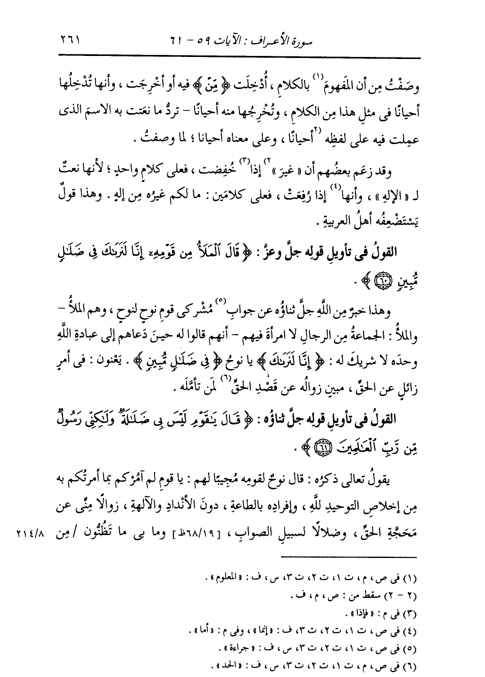 §الْقَوْلُ فِي تَأْوِيلِ قَوْلِهِ تَعَالَى: {قَالَ الْمَلَأُ مِنْ قَوْمِهِ إِنَّا لَنَرَاكَ فِي ضَلَالٍ مُبِينٍ} [الأعراف: 60] وَهَذَا خَبَرٌ مِنَ اللَّهِ جَلَّ ثَنَاؤُهُ عَنْ جَوَابِ مُشْرِكِي قَوْمِ نُوحٍ لِنُوحٍ، وَهُمُ الْمَلَأُ وَالْمَلَأُ: الْجَمَاعَةُ مِنَ الرِّجَالِ لَا امْرَأَةَ فِيهِمْ أَنَّهُمْ قَالُوا لَهُ حِينَ دَعَاهُمْ إِلَى عِبَادَةِ اللَّهِ وَحْدَهُ لَا شَرِيكَ لَهُ: {إِنَّا لَنَرَاكَ} [الأعراف: 60] يَا نُوحُ {فِي ضَلَالٍ مُبِينٍ} [الأنعام: 74] ، يَعْنُونَ: فِي أَمْرٍ زَائِلٍ عَنِ الْحَقِّ، مُبِينٌ زَوَالُهُ عَنْ قَصْدِ الْحَدِّ لِمَنْ تَأَمَّلَهُ