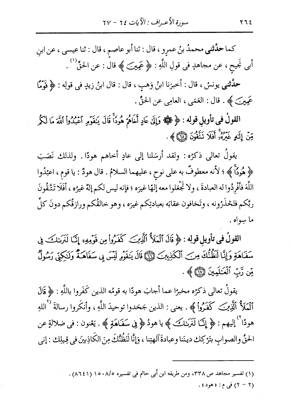 كَمَا حَدَّثَنِي مُحَمَّدُ بْنُ عَمْرٍو، قَالَ: ثنا أَبُو عَاصِمٍ، قَالَ: ثنا عِيسَى، عَنِ ابْنِ أَبِي نَجِيحٍ، عَنْ مُجَاهِدٍ، فِي قَوْلِ اللَّهِ: {§عَمِينَ} [الأعراف: 64] قَالَ: «عَنِ الْحَقِّ»