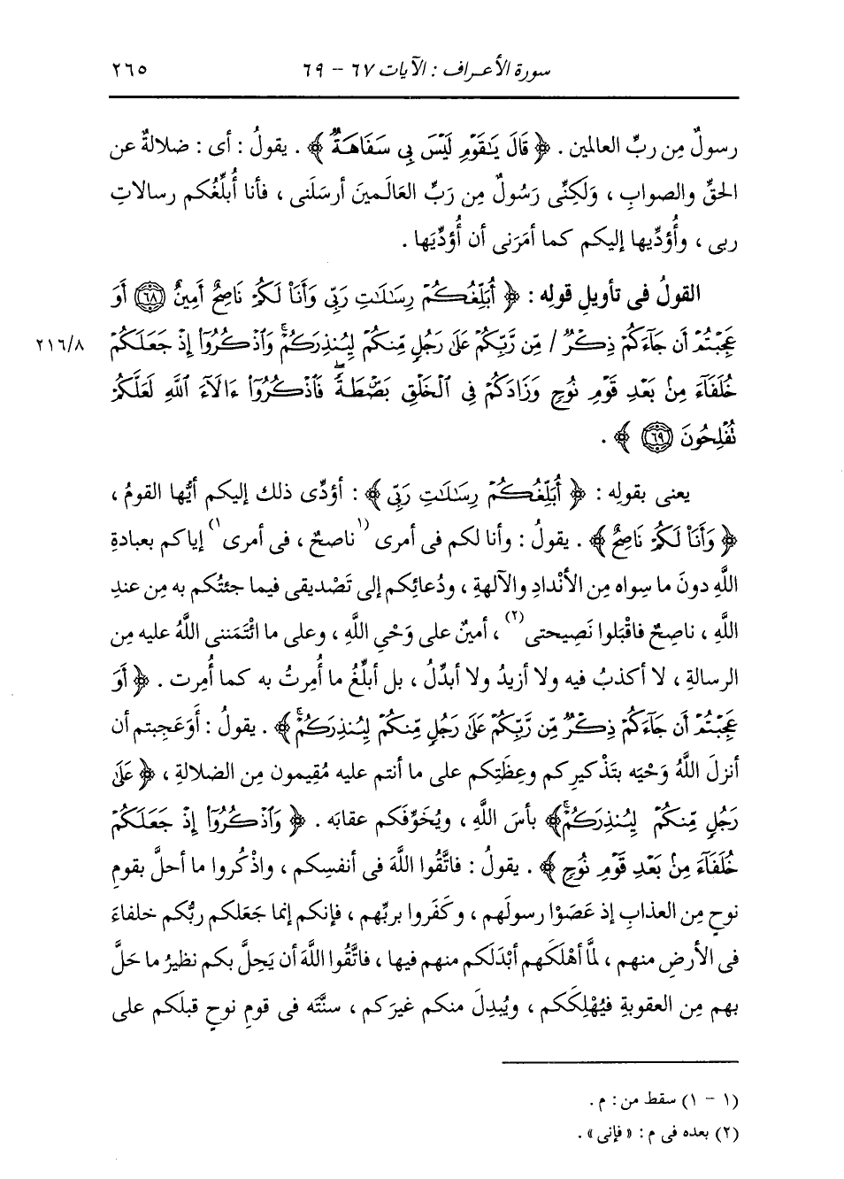 §الْقَوْلُ فِي تَأْوِيلِ قَوْلِهِ تَعَالَى: {أُبَلِّغُكُمْ رِسَالِاتِ رَبِّي وَأَنَا لَكُمْ نَاصِحٌ أَمِينٌ. أَوَعَجِبْتُمْ أَنْ جَاءكُمْ ذِكْرٌ مِنْ رَّبِّكُمْ عَلَى رَجُلٍ مِنْكُمْ لِيُنْذِرَكُمْ وَاذكُرُوا إِذْ جَعَلَكُمْ خُلَفَاءَ مِنْ بَعْدِ قَوْمِ نُوحٍ وَزَادَكُمْ فِي الْخَلْقِ بَسْطَةً فَاذْكُرُوا آلَاءَ اللَّهِ لَعَلَّكُمْ تُفْلِحُونَ} [الأعراف: 69] يَعْنِي بِقَوْلِهِ: {أُبَلِّغُكُمْ رِسَالَاتِ رَبِّي} [الأعراف: 62] : أُؤَدِّي ذَلِكَ إِلَيْكُمْ أَيُّهَا الْقَوْمُ. {وَأَنَا لَكُمْ نَاصِحٌ} [الأعراف: 68] يَقُولُ: وَأَنَا لَكُمْ فِي أَمْرِي إِيَّاكُمْ بِعِبَادَةِ اللَّهِ دُونَ مَا سِوَاهُ مِنَ الْأَنْدَادِ وَالْآلِهَةِ، وَدُعَائِكُمْ إِلَى تَصْدِيقِي فِيمَا جِئْتُكُمْ بِهِ مِنْ عِنْدِ اللَّهِ، نَاصِحٌ، فَاقْبَلُوا نَصِيحَتِي، فَإِنِّي أَمِينٌ عَلَى وَحْيِ اللَّهِ وَعَلَى مَا ائْتَمَنَنِي اللَّهُ عَلَيْهِ مِنَ الرِّسَالَةِ، لَا أَكْذِبُ فِيهِ وَلَا أَزِيدُ وَلَا أُبَدِّلُ، بَلْ أُبَلِّغُ مَا أُمِرْتُ بِهِ كَمَا أُمِرْتُ {أَوَعَجِبْتُمْ أَنْ جَاءَكُمْ ذِكْرٌ مِنْ رَبِّكُمْ عَلَى رَجُلٍ مِنْكُمْ لِيُنْذِرَكُمْ} [الأعراف: 63] ، يَقُولُ: أَوَعَجِبْتُمْ أَنْ أَنْزَلَ اللَّهُ وَحْيَهُ بِتَذْكِيرِكُمْ وَعِظَتِكُمْ عَلَى مَا أَنْتُمْ عَلَيْهِ مُقِيمُونَ مِنَ الضَّلَالَةِ، عَلَى رَجُلٍ مِنْكُمْ، لِيُنْذِرَكُمْ بَأْسَ اللَّهِ وَيُخَوِّفَكُمْ عِقَابَهُ. {وَاذْكُرُوا إِذْ جَعَلَكُمْ خُلَفَاءَ مِنْ بَعْدِ قَوْمِ نُوحٍ} [الأعراف: 69] ، يَقُولُ: فَاتَّقُوا اللَّهَ فِي أَنْفُسِكُمْ، وَاذْكُرُوا مَا حَلَّ بِقَوْمِ نُوحٍ مِنَ الْعَذَابِ إِذْ عَصَوْا رَسُولَهُمْ وَكَفَرُوا بِرَبِّهِمْ، فَإِنَّكُمْ إِنَّمَا جَعَلَكُمْ رَبُّكُمْ خُلَفَاءَ فِي الْأَرْضِ مِنْهُمْ، لَمَّا أَهْلَكَهُمْ أَبْدَلَكُمْ مِنْهُمْ فِيهَا، فَاتَّقُوا اللَّهَ أَنْ يَحِلَّ بِكُمْ نَظِيرُ مَا حَلَّ بِهِمْ مِنَ الْعُقُوبَةِ فَيُهْلِكَكُمْ وَيُبَدِّلَ مِنْكُمْ غَيْرَكُمْ، سُنَّتَهُ فِي قَوْمِ نُوحٍ قَبْلَكُمْ عَلَى
