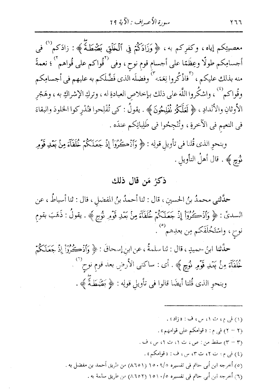 ذِكْرُ مَنْ قَالَ ذَلِكَ حَدَّثَنِي مُحَمَّدُ بْنُ الْحُسَيْنِ، قَالَ: ثنا أَحْمَدُ بْنُ الْمُفَضَّلِ، قَالَ: ثنا أَسْبَاطٌ، عَنِ السُّدِّيِّ: {§وَاذْكُرُوا إِذْ جَعَلَكُمْ خُلَفَاءَ مِنْ بَعْدَ قَوْمِ نُوحٍ} [الأعراف: 69] يَقُولُ: «ذَهَبَ بِقَوْمِ نُوحٍ وَاسْتَخْلَفَكُمْ مِنْ بَعْدِهِمْ»