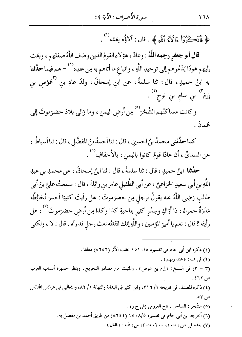 حَدَّثَنَا ابْنُ حُمَيْدٍ، قَالَ: ثنا سَلَمَةُ، قَالَ: ثنا ابْنُ إِسْحَاقَ، عَنْ مُحَمَّدِ بْنِ عَبْدِ اللَّهِ بْنِ أَبِي سَعِيدٍ الْخُزَاعِيِّ، عَنْ أَبِي الطُّفَيْلِ عَامِرِ بْنِ وَاثِلَةَ قَالَ: سَمِعْتُ عَلِيَّ بْنَ أَبِي طَالِبٍ، عَلَيْهِ السَّلَامُ يَقُولُ لِرَجُلٍ مِنْ حَضْرَمَوْتٍ: " هَلْ رَأَيْتَ كَثِيبًا أَحْمَرَ يُخَالِطُهُ مَدَرَةٌ حَمْرَاءُ ذَا أَرَاكٍ وَسِدْرٍ كَثِيرٍ بِنَاحِيَةِ كَذَا وَكَذَا مِنْ أَرْضِ حَضْرَمَوْتٍ، هَلْ رَأَيْتَهُ؟ قَالَ: نَعَمْ يَا أَمِيرَ الْمُؤْمِنِينَ، وَاللَّهِ إِنَّكَ لَتَنْعِتُهُ نَعْتَ رَجُلٍ قَدْ رَآهُ. قَالَ: لَا، وَلَكِنِّي -[269]- قَدْ حُدِّثْتُ عَنْهُ. فَقَالَ الْحَضْرَمِيُّ: وَمَا شَأْنُهُ يَا أَمِيرَ الْمُؤْمِنِينَ؟ قَالَ: «§فِيهِ قَبْرُ هُودٍ صَلَوَاتُ اللَّهِ عَلَيْهِ»