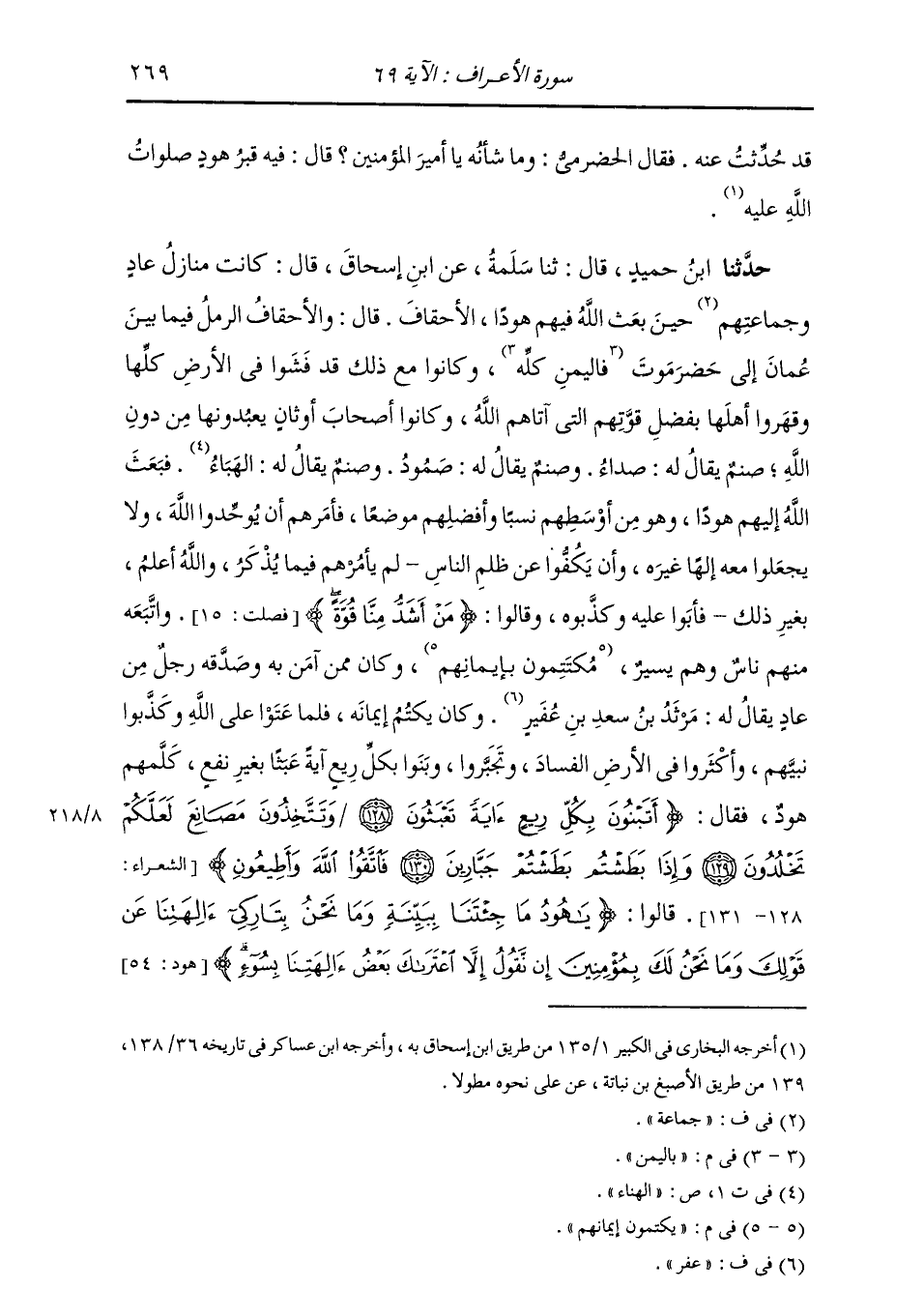 حَدَّثَنَا ابْنُ حُمَيْدٍ، قَالَ: ثنا سَلَمَةُ، عَنِ ابْنِ إِسْحَاقَ، قَالَ: " كَانَتْ مَنَازِلُ عَادٍ وَجَمَاعَتُهُمْ حِينَ بَعَثَ اللَّهُ فِيهِمْ هُودًا الْأَحْقَافَ، قَالَ: وَالْأَحْقَافُ: الرَّمْلُ فِيمَا بَيْنَ عُمَانَ إِلَى حَضْرَمَوْتٍ بِالْيَمَنِ، وَكَانُوا مَعَ ذَلِكَ §قَدْ فَشَوْا فِي الْأَرْضِ كُلِّهَا، وَقَهَرُوا أَهْلَهَا بِفَضْلِ قُوَّتِهِمُ الَّتِي آتَاهُمُ اللَّهُ، وَكَانُوا أَصْحَابَ أَوْثَانٍ يَعْبُدُونَهَا مِنْ دُونِ اللَّهِ: صَنَمٌ يُقَالُ لَهُ: صُدَاءٌ، وَصَنَمٌ يُقَالُ لَهُ: صُمُودٌ، وَصَنَمٌ يُقَالُ لَهُ: الْهَبَاءُ. فَبَعَثَ اللَّهُ إِلَيْهِمْ هُودًا، وَهُوَ مِنْ أَوْسَطِهِمْ نَسَبًا وَأَفْضَلِهِمْ مَوْضِعًا، فَأَمَرَهُمْ أَنْ يُوَحِّدُوا اللَّهَ وَلَا يَجْعَلُوا مَعَهُ إِلَهًا غَيْرَهُ، وَأَنْ يَكُفُّوا عَنْ ظُلْمِ النَّاسِ، وَلَمْ يَأْمُرْهُمْ فِيمَا يُذْكَرُ وَاللَّهُ أَعْلَمُ بِغَيْرِ ذَلِكَ. فَأَبَوْا عَلَيْهِ وَكَذَّبُوهُ، وَقَالُوا: مَنْ أَشَدُّ مِنَّا قُوَّةً؟ وَاتَّبَعَهُ مِنْهُمْ نَاسٌ وَهُمْ يَسِيرٌ، يَكْتُمُونَ إِيمَانَهُمْ، وَكَانَ مِمَّنْ آمَنَ بِهِ وَصَدَّقَهُ رَجُلٌ مِنْ عَادٍ يُقَالُ لَهُ مَرْثَدُ بْنُ سَعْدِ بْنِ عُفَيْرٍ، وَكَانَ يَكْتُمُ إِيمَانَهُ، فَلَمَّا عَتَوْا عَلَى اللَّهِ وَكَذَّبُوا نَبِيَّهُمْ، وَأَكْثَرُوا فِي الْأَرْضِ الْفَسَادَ، وَتَجَبَّرُوا وَبَنَوْا بِكُلِّ رِيعٍ آيَةً عَبَثًا بِغَيْرِ نَفْعٍ، كَلَّمَهُمْ هُودٌ فَقَالَ: {أَتَبْنُونَ بِكُلِّ رِيعٍ آيَةً تَعْبَثُونَ وَتَتَّخِذُونَ مَصَانِعَ لَعَلَّكُمْ تَخْلُدُونَ. وَإِذَا بَطَشْتُمْ بَطَشْتُمْ جَبَّارِينَ فَاتَّقُوا اللَّهَ وَأَطِيعُونَ} [الشعراء: 129] ، {قَالُوا يَا هُودُ مَا جِئْتَنَا بِبَيِّنَةٍ وَمَا نَحْنُ بِتَارِكِي آلِهَتَنَا عَنْ قَوْلِكَ وَمَا نَحْنُ لَكَ بِمُؤْمِنِينَ إِنْ نَقُولُ إِلَّا اعْتَرَاكَ بَعْضُ آلِهَتِنَا بِسُوءٍ} [هود: 53] : -[270]- أَيْ مَا هَذَا الَّذِي جِئْتَنَا بِهِ إِلَّا جُنُونٌ أَصَابَكَ بِهِ بَعْضُ آلِهَتِنَا هَذِهِ الَّتِي تَعِيبُ، {قَالَ إِنِّي أُشْهِدُ اللَّهَ وَاشْهَدُوا أَنِّي بَرِيءٌ مِمَّا تُشْرِكُونَ مِنْ دُونِهِ فَكِيدُونِي جَمِيعًا ثُمَّ لَا تُنْظِرُونَ} [هود: 54] إِلَى قَوْلِهِ: {صِرَاطٍ مُسْتَقِيمٍ} [البقرة: 142] ، فَلَمَّا فَعَلُوا ذَلِكَ أَمْسَكَ اللَّهُ عَنْهُمُ الْمَطَرَ مِنَ السَّمَاءِ ثَلَاثَ سِنِينَ فِيمَا يَزْعُمُونَ، حَتَّى جَهَدَهُمْ ذَلِكَ. وَكَانَ النَّاسُ فِي ذَلِكَ الزَّمَانِ إِذَا نَزَلَ بِهِمْ بَلَاءٌ أَوْ جَهْدٌ، فَطَلَبُوا إِلَى اللَّهِ الْفَرَجَ مِنْهُ، كَانَتْ طِلْبَتُهُمْ إِلَى اللَّهِ عِنْدَ بَيْتِهِ الْحَرَامِ بِمَكَّةَ، مُسْلِمُهُمْ وَمُشْرِكُهُمْ، فَيَجْتَمِعُ بِمَكَّةَ نَاسٌ كَثِيرٌ شَتَّى مُخْتَلِفَةٌ أَدْيَانُهُمْ، وَكُلُّهُمْ مُعَظِّمٌ لِمَكَّةَ يَعْرِفُ حُرْمَتَهَا وَمَكَانَهَا مِنَ اللَّهِ. قَالَ ابْنُ إِسْحَاقَ: وَكَانَ الْبَيْتُ فِي ذَلِكَ الزَّمَانِ مَعْرُوفًا مَكَانُهُ، وَالْحَرَمُ قَائِمًا فِيمَا يَذْكُرُونَ، وَأَهْلُ مَكَّةَ يَوْمَئِذٍ الْعَمَالِيقُ، وَإِنَّمَا سُمُّوا الْعَمَالِيقَ لِأَنَّ أَبَاهُمْ عِمْلِيقُ بْنُ لَاوِذَ بْنِ سَامِ بْنِ نُوحٍ، وَكَانَ سَيِّدُ الْعَمَالِيقِ إِذْ ذَاكَ بِمَكَّةَ فِيمَا يَزْعُمُونَ رَجُلًا يُقَالُ لَهُ: مُعَاوِيَةُ بْنُ بَكْرٍ، وَكَانَ أَبُوهُ حَيًّا فِي ذَلِكَ الزَّمَانِ وَلَكِنَّهُ كَانَ قَدْ كَبِرَ، وَكَانَ ابْنُهُ يَرْأَسُ قَوْمَهُ، وَكَانَ السُّؤْدَدُ وَالشَّرَفُ مِنَ الْعَمَالِيقِ فِيمَا يَزْعُمُونَ فِي أَهْلِ ذَلِكَ الْبَيْتِ، وَكَانَتْ أُمُّ مُعَاوِيَةَ بْنِ بَكْرٍ كَلْهَدَةَ ابْنَةُ الْخَيْبَرِيِّ رَجُلٍ مِنْ عَادٍ. فَلَمَّا قَحَط