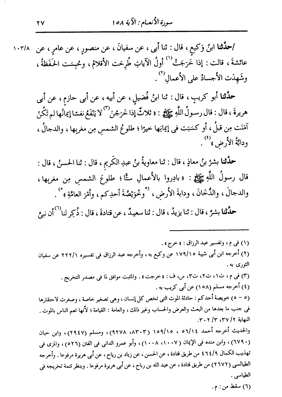 حَدَّثَنَا بِشْرُ بْنُ مُعَاذٍ، قَالَ: ثنا مُعَاوِيَةُ بْنُ عَبْدِ الْكَرِيمِ، قَالَ: ثنا الْحَسَنُ، قَالَ: قَالَ رَسُولُ اللَّهِ صَلَّى اللهُ عَلَيْهِ وَسَلَّمَ: " §بَادِرُوا بِالْأَعْمَالِ سِتًّا: طُلُوعَ الشَّمْسِ مِنْ مَغْرِبِهَا، وَالدَّجَّالَ، وَالدُّخَانَ، وَدَابَّةَ الْأَرْضِ، وَخُوَيْصَّةَ أَحَدِكُمْ، وَأَمْرَ الْعَامَّةِ " حَدَّثَنَا بِشْرٌ، قَالَ: ثنا يَزِيدُ، قَالَ: ثنا سَعِيدٌ، عَنْ قَتَادَةَ، قَالَ: ذُكِرَ أَنَّ نَبِيَّ -[28]- اللَّهِ صَلَّى اللهُ عَلَيْهِ وَسَلَّمَ يَقُولُ، فَذَكَرَ نَحْوَهُ وَأَوْلَى الْأَقْوَالِ بِالصَّوَابِ فِي ذَلِكَ، مَا تَظَاهَرَتْ بِهِ الْأَخْبَارُ عَنْ رَسُولِ اللَّهِ صَلَّى اللهُ عَلَيْهِ وَسَلَّمَ أَنَّهُ قَالَ ذَلِكَ حِينَ تَطْلُعُ الشَّمْسُ مِنْ مَغْرِبِهَا "