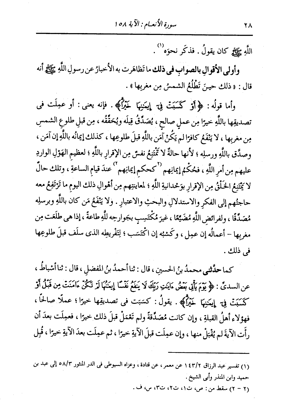 كَمَا حَدَّثَنِي مُحَمَّدُ بْنُ الْحُسَيْنِ، قَالَ: ثنا أَحْمَدُ بْنُ الْمُفَضَّلِ، قَالَ: ثنا أَسْبَاطٌ، عَنِ السُّدِّيِّ: {§يَوْمَ يَأْتِي بَعْضُ آيَاتِ رَبِّكَ لَا يَنْفَعُ نَفْسًا إِيمَانُهَا لَمْ تَكُنْ آمَنَتْ مِنْ قَبْلُ أَوْ كَسَبَتْ فِي إِيمَانِهَا خَيْرًا} [الأنعام: 158] ، يَقُولُ: «كَسَبَتْ فِي تَصْدِيقِهَا خَيْرًا عَمَلًا صَالِحًا، فَهَؤُلَاءِ أَهْلُ الْقِبْلَةِ. وَإِنْ كَانَتْ مُصَدِّقَةً وَلَمْ تَعْمَلْ قَبْلَ ذَلِكَ خَيْرًا فَعَمِلَتْ بَعْدَ أَنْ رَأَتِ الْآيَةَ لَمْ يُقْبَلْ مِنْهَا. وَإِنْ عَمِلَتْ قَبْلَ الْآيَةِ خَيْرًا ثُمَّ عَمِلَتْ بَعْدَ الْآيَةِ خَيْرًا، قُبِلَ -[29]- مِنْهَا»
