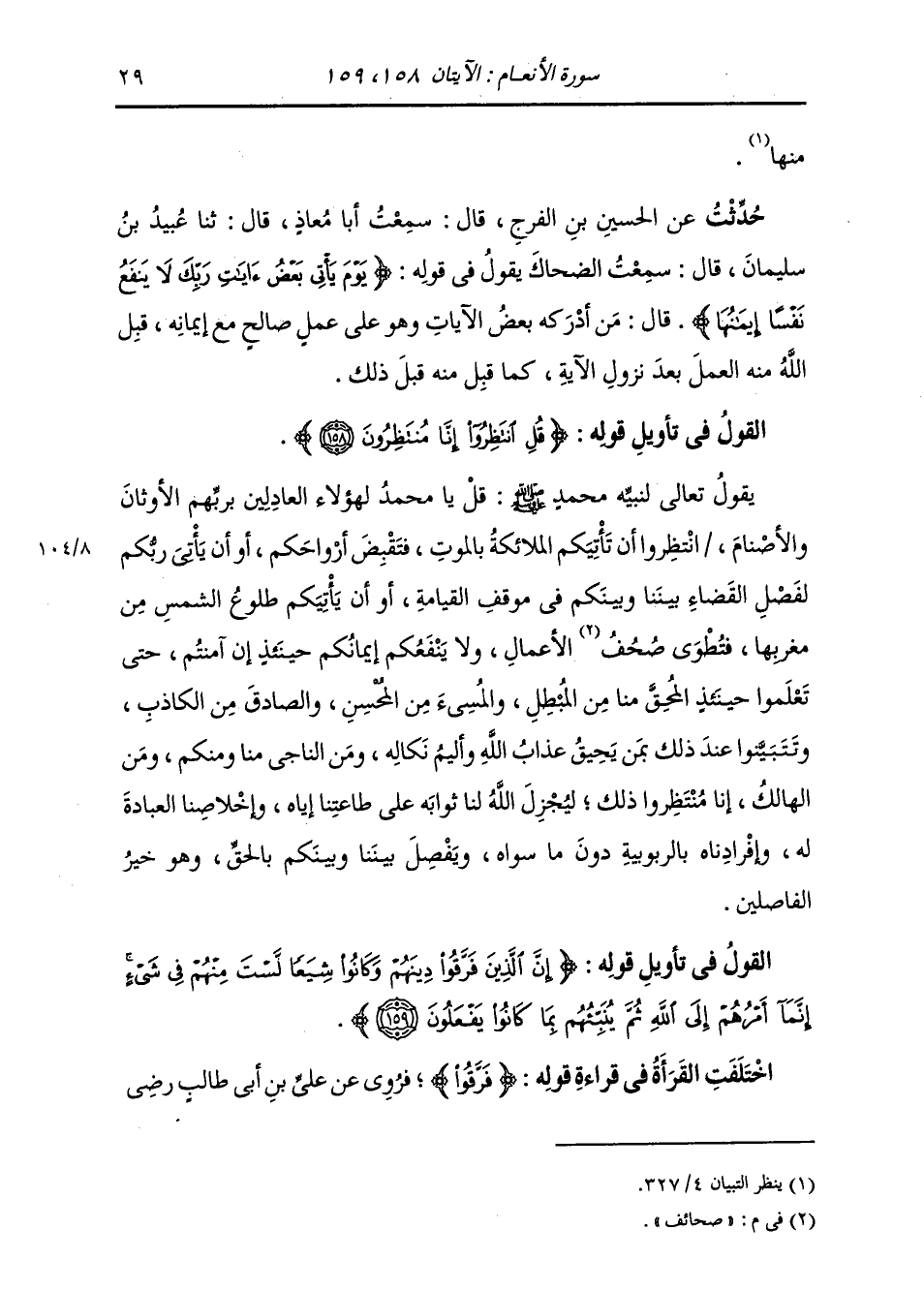 §الْقَوْلُ فِي تَأْوِيلِ قَوْلِهِ تَعَالَى: {قُلِ انْتَظِرُوا إِنَّا مُنْتَظِرُونَ} [الأنعام: 158] يَقُولُ تَعَالَى لِنَبِيِّهِ مُحَمَّدٍ صَلَّى اللهُ عَلَيْهِ وَسَلَّمَ: قُلْ يَا مُحَمَّدُ لِهَؤُلَاءِ الْعَادِلِينَ بِرَبِّهِمُ الْأَوْثَانَ وَالْأَصْنَامَ: انْتَظِرُوا أَنْ تَأْتِيَكُمُ الْمَلَائِكَةُ بِالْمَوْتِ، فَتَقْبِضَ أَرْوَاحَكُمْ، أَوْ أَنْ يَأْتِيَ رَبُّكَ لِفَصْلِ الْقَضَاءِ بَيْنَنَا وَبَيْنَكُمْ فِي مَوْقِفِ الْقِيَامَةِ، أَوْ أَنْ يَأْتِيَكُمْ طُلُوعُ الشَّمْسِ مِنْ مَغْرِبِهَا، فَتُطْوَى صَحَائِفُ الْأَعْمَالِ، وَلَا يَنْفَعُكُمْ إِيمَانُكُمْ حِينَئِذٍ إِنْ آمَنْتُمْ، حَتَّى تَعْلَمُوا حِينَئِذٍ الْمُحِقَّ مِنَّا مِنَ الْمُبْطِلِ، وَالْمُسِيءَ مِنَ الْمُحْسِنِ، وَالصَّادِقَ مِنَ الْكَاذِبِ، وَتَتَبَيَّنُوا عِنْدَ ذَلِكَ بِمَنْ يَحِيقُ عَذَابُ اللَّهِ وَأَلِيمُ نَكَالِهِ، وَمَنِ النَّاجِي مِنَّا وَمِنْكُمْ وَمَنِ الْهَالِكُ، إِنَّا مُنْتَظِرُو ذَلِكَ، لِيُجْزِلَ اللَّهُ لَنَا ثَوَابَهُ عَلَى طَاعَتِنَا إِيَّاهُ، وَإِخْلَاصِنَا الْعِبَادَةَ لَهُ، وَإِفْرَادِنَاهُ بِالرُّبُوبِيَّةِ دُونَ مَا سِوَاهُ، وَيَفْصِلُ بَيْنَنَا وَبَيْنَكُمْ بِالْحَقِّ، وَهُوَ خَيْرُ الْفَاصِلِينَ