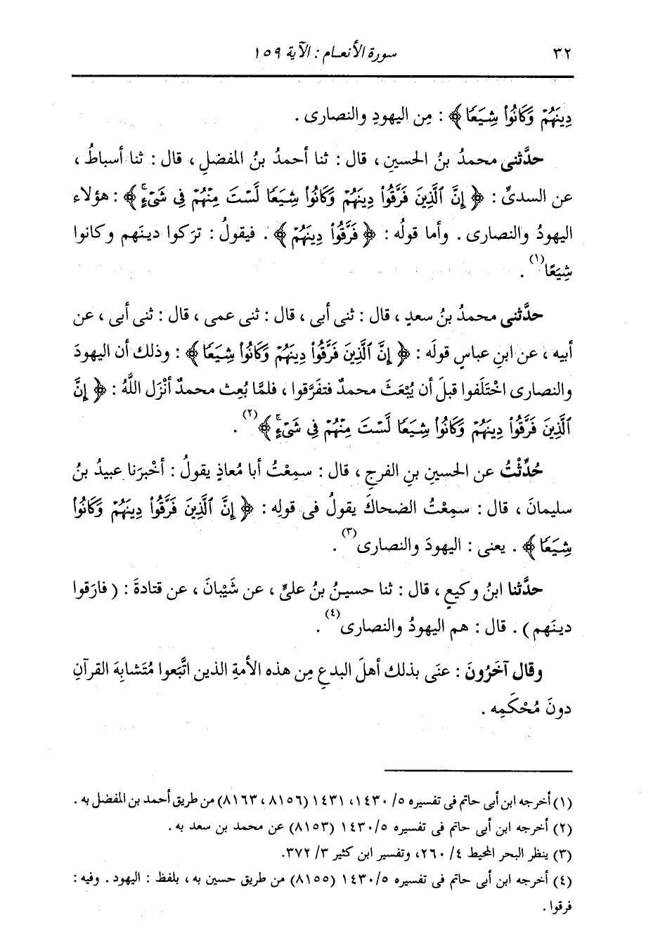 حَدَّثَنِي مُحَمَّدُ بْنُ الْحُسَيْنِ، قَالَ: ثنا أَحْمَدُ بْنُ الْمُفَضَّلِ، قَالَ: ثنا أَسْبَاطٌ، عَنِ السُّدِّيِّ: {§إِنَّ الَّذِينَ فَرَّقُوا دِينَهُمْ وَكَانُوا شِيَعًا لَسْتَ مِنْهُمْ فِي شَيْءٍ} [الأنعام: 159] : «هَؤُلَاءِ الْيَهُودُ وَالنَّصَارَى»