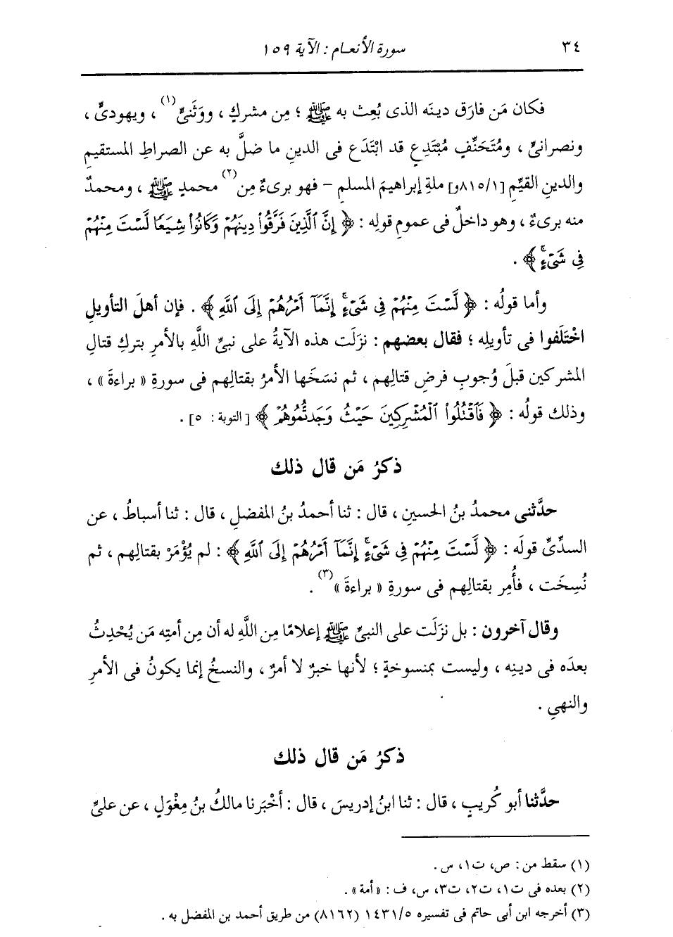 ذِكْرُ مَنْ قَالَ ذَلِكَ حَدَّثَنِي مُحَمَّدُ بْنُ الْحُسَيْنِ، قَالَ: ثنا أَحْمَدُ بْنُ الْمُفَضَّلِ، قَالَ: ثنا أَسْبَاطٌ، عَنِ السُّدِّيِّ: قَوْلُهُ: {§لَسْتَ مِنْهُمْ فِي شَيْءٍ إِنَّمَا أَمْرُهُمْ إِلَى اللَّهِ} [الأنعام: 159] : " لَمْ يُؤْمَرْ بِقِتَالِهِمْ، ثُمَّ نُسِخَتْ، فَأُمِرَ بِقِتَالِهِمْ فِي سُورَةِ بَرَاءَةَ وَقَالَ آخَرُونَ: بَلْ نَزَلَتْ عَلَى النَّبِيِّ صَلَّى اللهُ عَلَيْهِ وَسَلَّمَ إِعْلَامًا مِنَ اللَّهِ لَهُ أَنَّ مِنَ أُمَّتِهِ مَنْ يُحْدِثُ بَعْدَهُ فِي دِينِهِ، وَلَيْسَتْ بِمَنْسُوخَةٍ، لِأَنَّهَا خَبَرٌ لَا أَمْرٌ، وَالنَّسْخُ إِنَّمَا يَكُونُ فِي الْأَمْرِ وَالنَّهْيِ