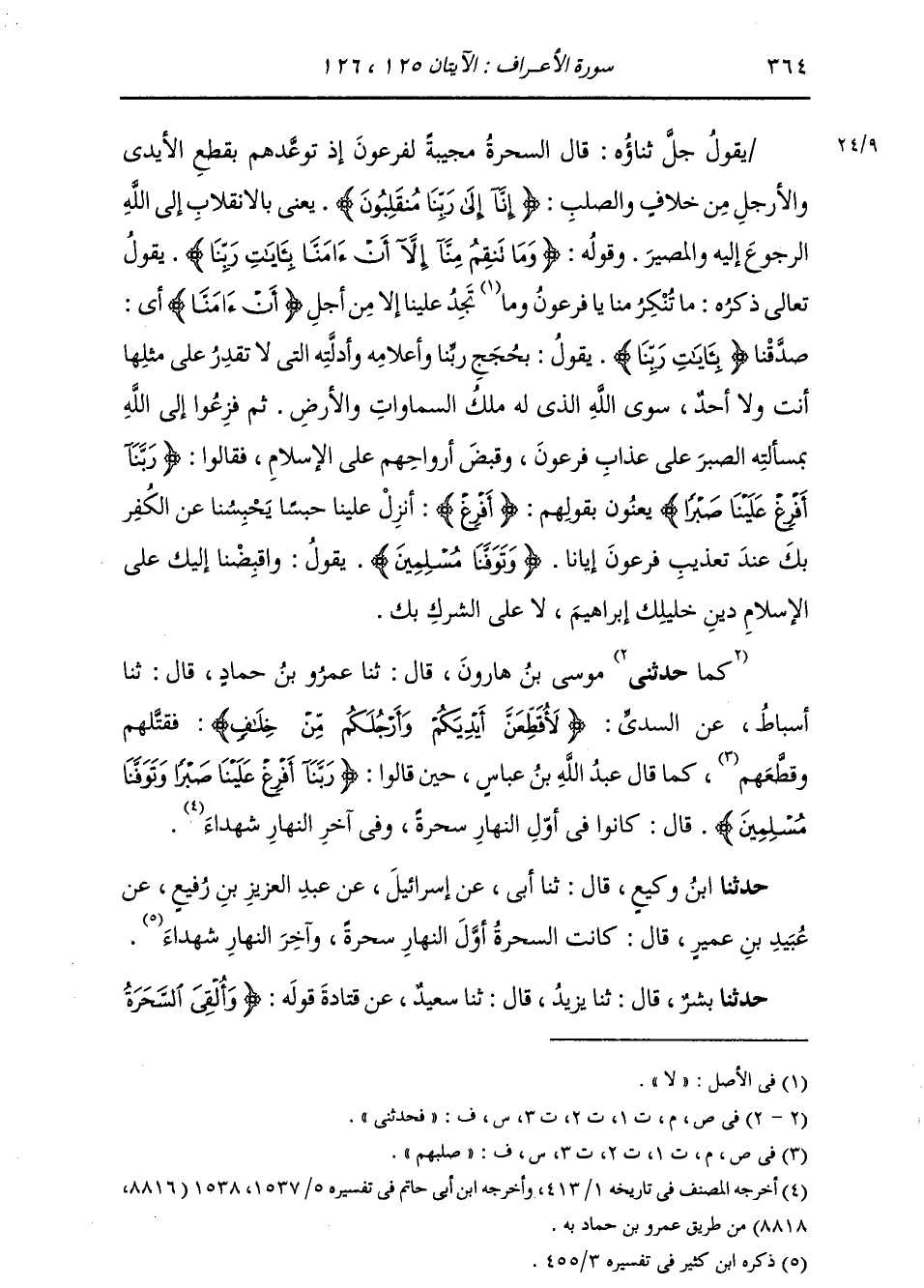 فَحَدَّثَنِي مُوسَى بْنُ هَارُونَ، قَالَ: ثنا عَمْرُو بْنُ حَمَّادٍ، قَالَ: ثنا أَسْبَاطٌ، عَنِ السُّدِّيِّ: {§لَأُقَطِّعَنَّ أَيْدِيَكُمْ وَأَرْجُلَكُمْ مِنْ خِلَافٍ} [الأعراف: 124] فَقَتَلَهُمْ وَصَلَبَهُمْ، كَمَا قَالَ عَبْدُ اللَّهِ بْنُ عَبَّاسٍ حِينَ قَالُوا: " {رَبَّنَا أَفْرِغْ عَلَيْنَا صَبْرًا وَتَوَفَّنَا مُسْلِمِينَ} [الأعراف: 126] قَالَ: كَانُوا فِي أَوَّلِ النَّهَارِ سَحَرَةً، وَفَى آخِرِ النَّهَارِ شُهَدَاءَ "