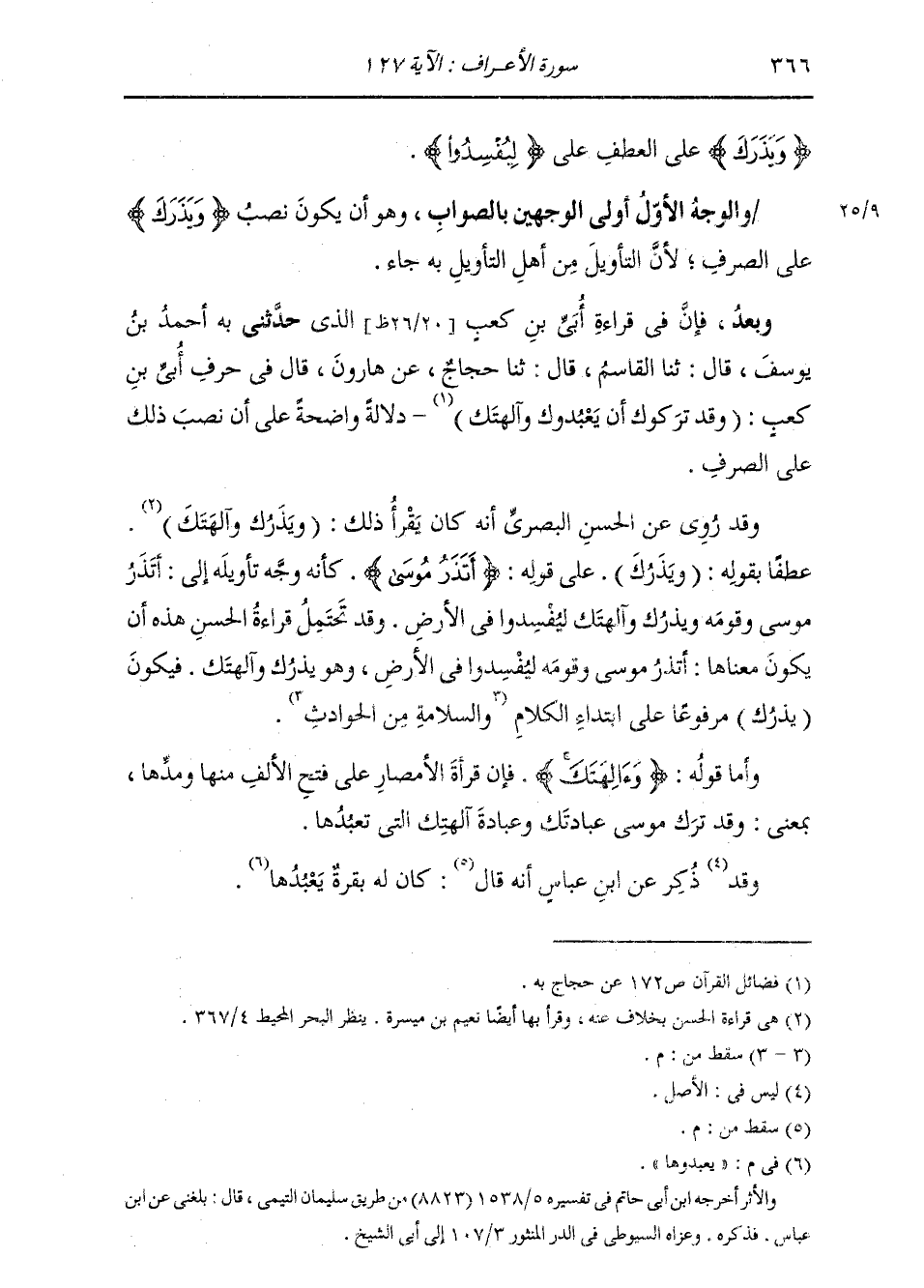 الَّذِي حَدَّثَنَا أَحْمَدُ بْنُ يُوسُفَ، قَالَ: ثنا الْقَاسِمُ، قَالَ: ثنا حَجَّاجٌ، عَنْ هَارُونَ، قَالَ: فِي حَرْفِ أُبَيِّ بْنِ كَعْبٍ: «§وَقَدْ تَرَكُوكَ أَنْ يَعْبُدُوكَ وَآلِهَتَكَ» دَلَالَةٌ وَاضِحَةٌ عَلَى أَنَّ نَصْبَ ذَلِكَ عَلَى الصَّرْفِ. وَقَدْ رُوِيَ عَنِ الْحَسَنِ الْبَصْرِيِّ أَنَّهُ كَانَ يَقْرَأُ ذَلِكَ: (وَيَذَرُكَ وَآلِهَتَكَ) عَطْفًا بِقَوْلِهِ: (وَيَذَرُكَ) عَلَى قَوْلِهِ: {أَتَذَرُ مُوسَى} [الأعراف: 127] كَأَنَّهُ وَجَّهَ تَأْوِيلَهُ إِلَى: أَتَذَرُ مُوسَى وَقَوْمَهُ وَيَذَرُكَ وَآلِهَتَكَ لِيُفْسِدُوا فِي الْأَرْضِ؟ وَقَدْ تَحْتَمِلُ قِرَاءَةَ الْحَسَنِ هَذِهِ أَنْ يَكُونَ مَعْنَاهَا: أَتَذَرُ مُوسَى وَقَوْمَهُ لِيُفْسِدُوا فِي الْأَرْضِ وَهُوَ يَذَرُكَ وَآلِهَتَكَ؟ فَيَكُونُ يَذَرُكَ مَرْفُوعًا عَلَى ابْتِدَاءِ الْكَلَامِ