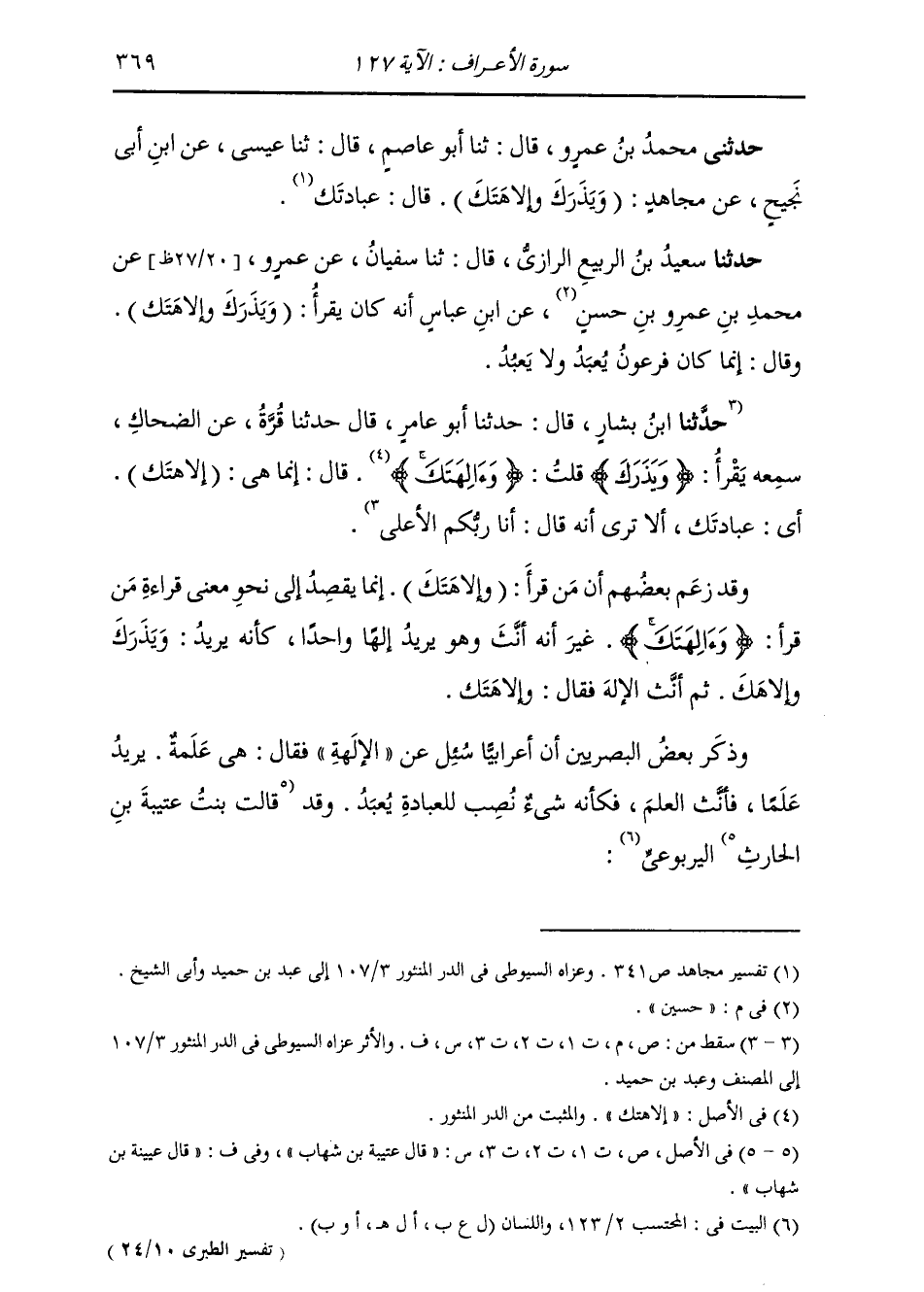 حَدَّثَنِي سَعِيدُ بْنُ الرَّبِيعِ الرَّازِيُّ، قَالَ: ثنا سُفْيَانُ، عَنْ عَمْرِو بْنِ دِينَارٍ، عَنْ مُحَمَّدِ بْنِ عَمْرِو بْنِ حُسَيْنٍ، عَنِ ابْنِ عَبَّاسٍ، أَنَّهُ كَانَ يَقْرَأُ: (§وَيَذَرَكَ وَإِلَاهَتَكَ) وَقَالَ: «إِنَّمَا كَانَ فِرْعَوْنُ يُعْبَدُ وَلَا يَعْبُدُ» وَقَدْ زَعَمَ بَعْضُهُمْ: أَنَّ مَنْ قَرَأَ: (وَإِلَاهَتَكَ) إِنَّمَا يَقْصُدُ إِلَى نَحْوِ مَعْنَى قِرَاءَةِ مَنْ قَرَأَ: {وَآلِهَتَكَ} [الأعراف: 127] غَيْرَ أَنَّهُ أَنَّثَ وَهُوَ يُرِيدُ إِلَهًا وَاحِدًا، كَأَنَّهُ يُرِيدُ: وَيَذَرَكَ وَإِلَهَكَ، ثُمَّ أَنَّثَ الْإِلَهَ فَقَالَ: وَإِلَاهَتَكَ وَذَكَرَ بَعْضُ الْبَصْرِيِّينَ أَنَّ أَعْرَابِيًّا سُئِلَ عَنِ الْإِلَاهَةِ فَقَالَ: هِيَ عَلَمَةٌ يُرِيدُ عَلَمًا، فَأَنَّثَ الْعَلَمَ، فَكَأَنَّهُ شَيْءٌ نُصِبَ لِلْعِبَادَةِ يُعْبَدُ. وَقَدْ قَالَتْ بِنْتُ عُتَيْبَةَ بْنِ الْحَارِثِ الْيَرْبُوعِيِّ: