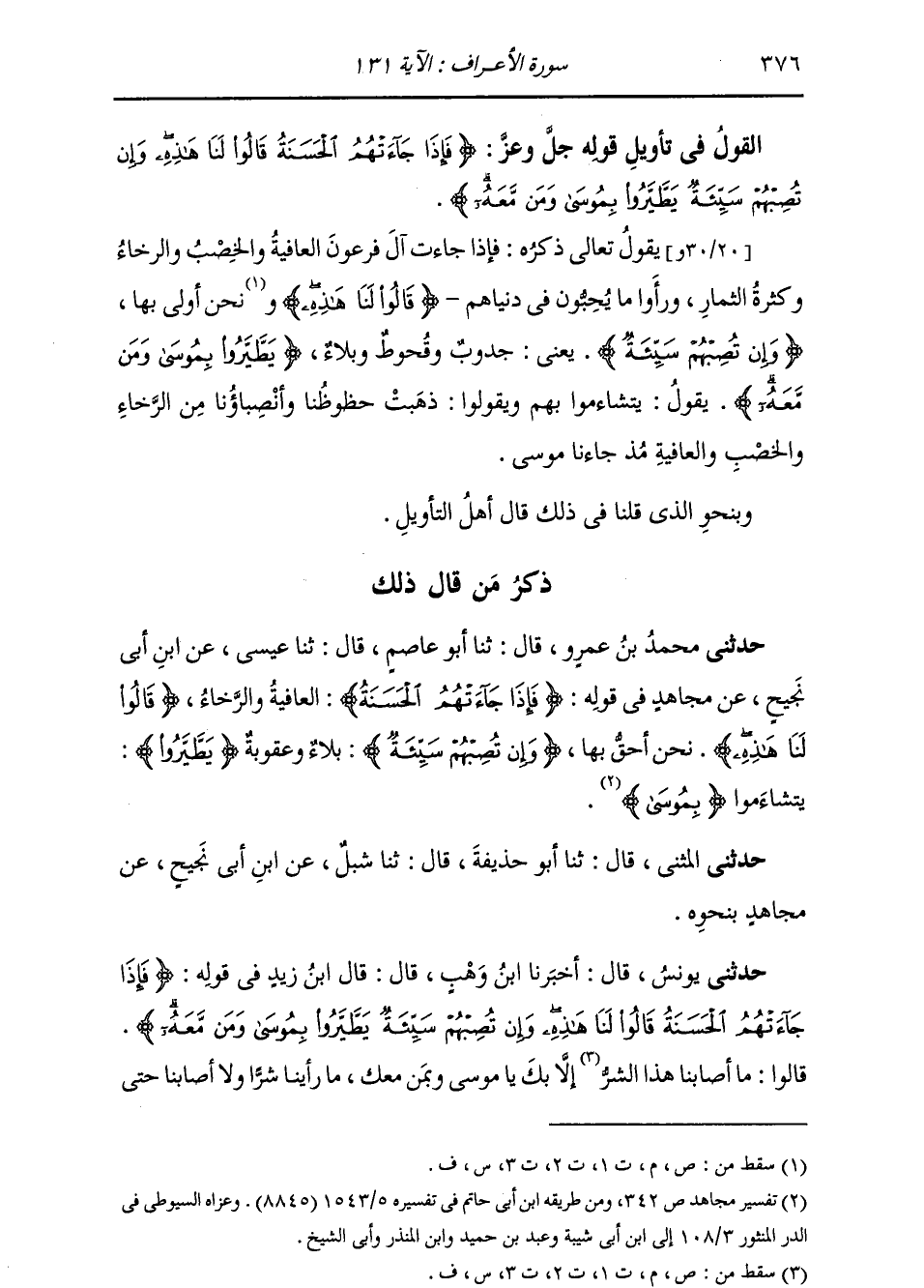حَدَّثَنِي مُحَمَّدُ بْنُ عَمْرٍو، قَالَ: ثنا أَبُو عَاصِمٍ، قَالَ: ثنا عِيسَى، عَنِ ابْنِ أَبِي نَجِيحٍ، عَنْ مُجَاهِدٍ، فِي قَوْلِهِ: " {§فَإِذَا جَاءَتْهُمُ الْحَسَنَةُ} [الأعراف: 131] الْعَافِيَةُ وَالرَّخَاءُ، {قَالُوا لَنَا هَذِهِ} [الأعراف: 131] نَحْنُ أَحَقُّ بِهَا. {وَإِنْ تُصِبْهُمْ سَيِّئَةٌ} [النساء: 78] بَلَاءٌ وَعُقُوبَةٌ، {يَطَّيَّرُوا} [الأعراف: 131] يَتَشَاءَمُوا {بِمُوسَى} [الأعراف: 131] " حَدَّثَنِي الْمُثَنَّى، قَالَ: ثنا أَبُو حُذَيْفَةَ، قَالَ: ثنا شِبْلٌ، عَنِ ابْنِ أَبِي نَجِيحٍ، عَنْ مُجَاهِدٍ بِنَحْوِهِ