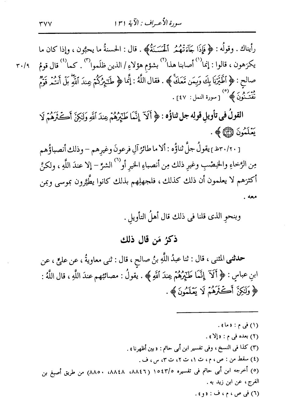 حَدَّثَنِي الْمُثَنَّى، قَالَ: ثنا عَبْدُ اللَّهِ بْنُ صَالِحٍ، قَالَ: ثني مُعَاوِيَةُ، عَنْ عَلِيٍّ، عَنِ ابْنِ عَبَّاسٍ: " {§أَلَا إِنَّمَا طَائِرُهُمْ عِنْدَ اللَّهِ} [الأعراف: 131] يَقُولُ: مَصَائِبُهُمْ عِنْدَ اللَّهِ، قَالَ اللَّهُ: {وَلَكِنَّ أَكْثَرَهُمْ لَا يَعْلَمُونَ} [الأعراف: 131] "
