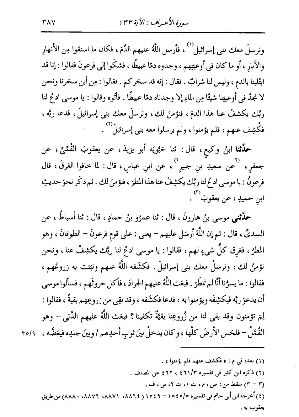 وَنُرْسِلَ مَعَكَ بَنِي إِسْرَائِيلَ، فَكُشِفَ عَنْهُمْ فَلَمْ يُؤْمِنُوا فَأَرْسَلَ اللَّهُ عَلَيْهِمُ الدَّمَ، فَكَانَ مَا اسْتَقَوْا مِنَ الْأَنْهَارِ وَالَآبَارِ، أَوْ مَا كَانَ فِي أَوْعِيَتِهِمْ وَجَدُوهُ دَمًا عَبِيطًا، فَشَكَوْا إِلَى فِرْعَوْنَ فَقَالُوا: إِنَّا قَدِ ابْتُلِينَا بِالدَّمِ، وَلَيْسَ لَنَا شَرَابٌ. فَقَالَ: إِنَّهُ قَدْ سَحَرَكُمْ. فَقَالُوا: مِنْ أَيْنَ سَحَرَنَا وَنَحْنُ لَا نَجْدُ فِي أَوْعِيَتِنَا شَيْئًا مِنَ الْمَاءِ إِلَّا وَجَدْنَاهُ دَمًا عَبِيطًا؟ فَأَتَوْهُ فَقَالُوا: يَا مُوسَى ادْعُ لَنَا رَبَّكَ يَكْشِفُ عَنَّا هَذَا الدَّمَ، فَنُؤْمِنَ لَكَ، وَنُرْسِلَ مَعَكَ بَنِي إِسْرَائِيلَ، فَدَعَا رَبَّهُ، فَكَشَفَ عَنْهُمْ، فَلَمْ يُؤْمِنُوا، وَلَمْ يُرْسِلُوا مَعَهُ بَنِي إِسْرَائِيلَ " حَدَّثَنَا ابْنُ وَكِيعٍ، قَالَ: ثنا حَبُّويَهْ الرَّازِيُّ، عَنْ يَعْقُوبَ الْقُمِّيِّ، عَنْ جَعْفَرٍ، عَنِ ابْنِ عَبَّاسٍ، قَالَ: " لَمَّا خَافُوا الْغَرَقَ، قَالَ فِرْعَوْنُ: يَا مُوسَى ادْعُ لَنَا رَبَّكَ يَكْشِفُ عَنَّا هَذَا الْمَطَرَ فَنُؤْمِنَ لَكَ " ثُمَّ ذَكَرَ نَحْوَ حَدِيثِ ابْنِ حُمَيْدٍ، عَنْ يَعْقُوبَ