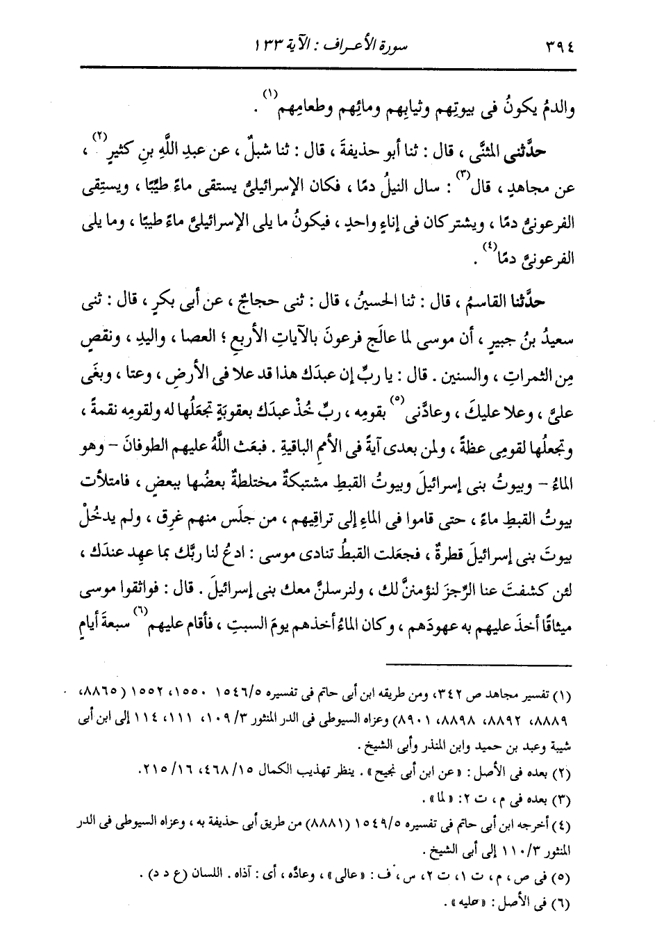 قَالَ: ثنا شِبْلٌ، عَنْ عَبْدِ اللَّهِ بْنِ كَثِيرٍ، عَنْ مُجَاهِدٍ، قَالَ: «§لَمَّا سَالَ النِّيلُ دَمًا، فَكَانَ الْإِسْرَائِيلِيُّ يَسْتَقِي مَاءً طَيِّبًا، وَيَسْتَقِي الْفِرْعَوْنِيُّ دَمًا وَيَشْتَرِكَانِ فِي إِنَاءٍ وَاحِدٍ، فَيَكُونُ مَا يَلِي الْإِسْرَائِيلِيَّ مَاءً طَيِّبًا وَمَا يَلِي الْفِرْعَوْنِيَّ دَمًا»