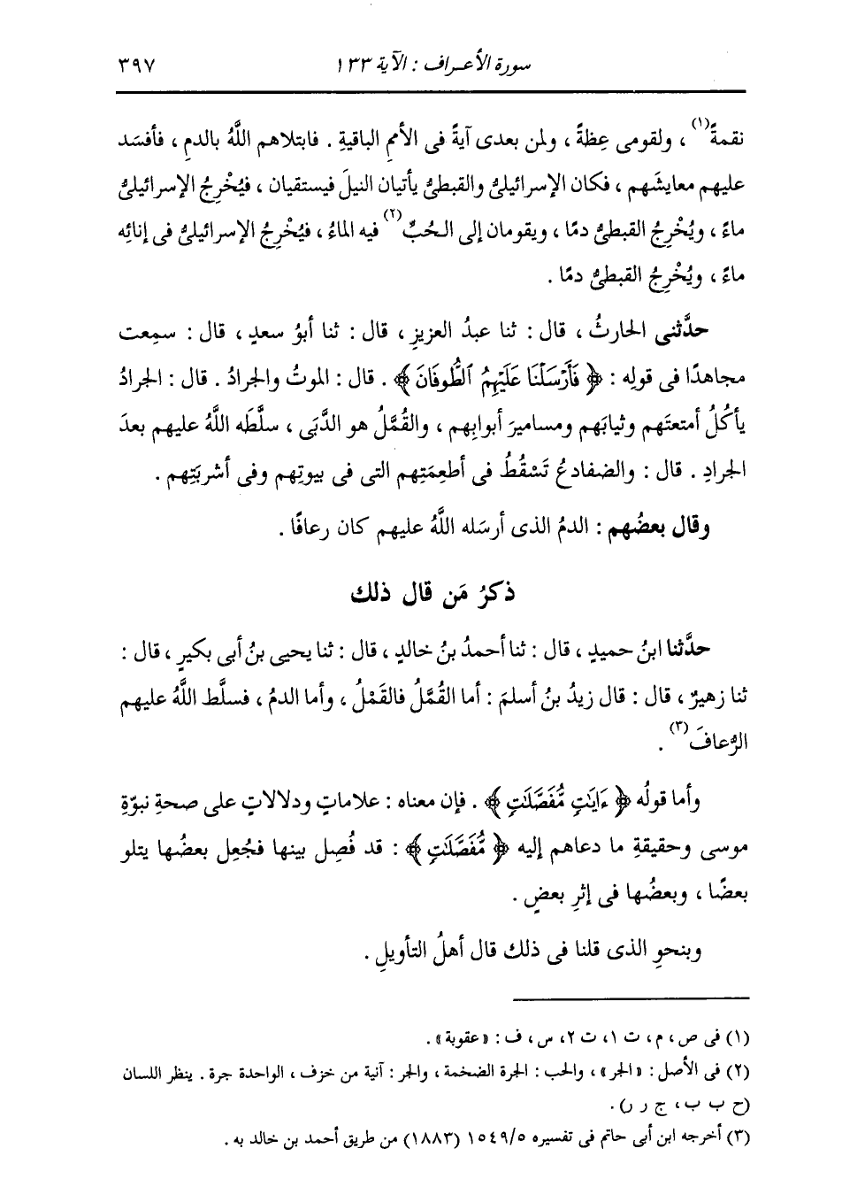حَدَّثَنَا ابْنُ حُمَيْدٍ، قَالَ: ثنا أَحْمَدُ بْنُ خَالِدٍ، قَالَ: ثنا يَحْيَى بْنُ أَبِي بُكَيْرٍ، قَالَ: ثنا زُهَيْرٌ، قَالَ: قَالَ زَيْدُ بْنُ أَسْلَمَ: " §أَمَا الْقُمَّلُ فَالْقَمْلُ وَأَمَّا الدَّمُ: فَسُلِّطَ عَلَيْهِمُ الرُّعَافُ "