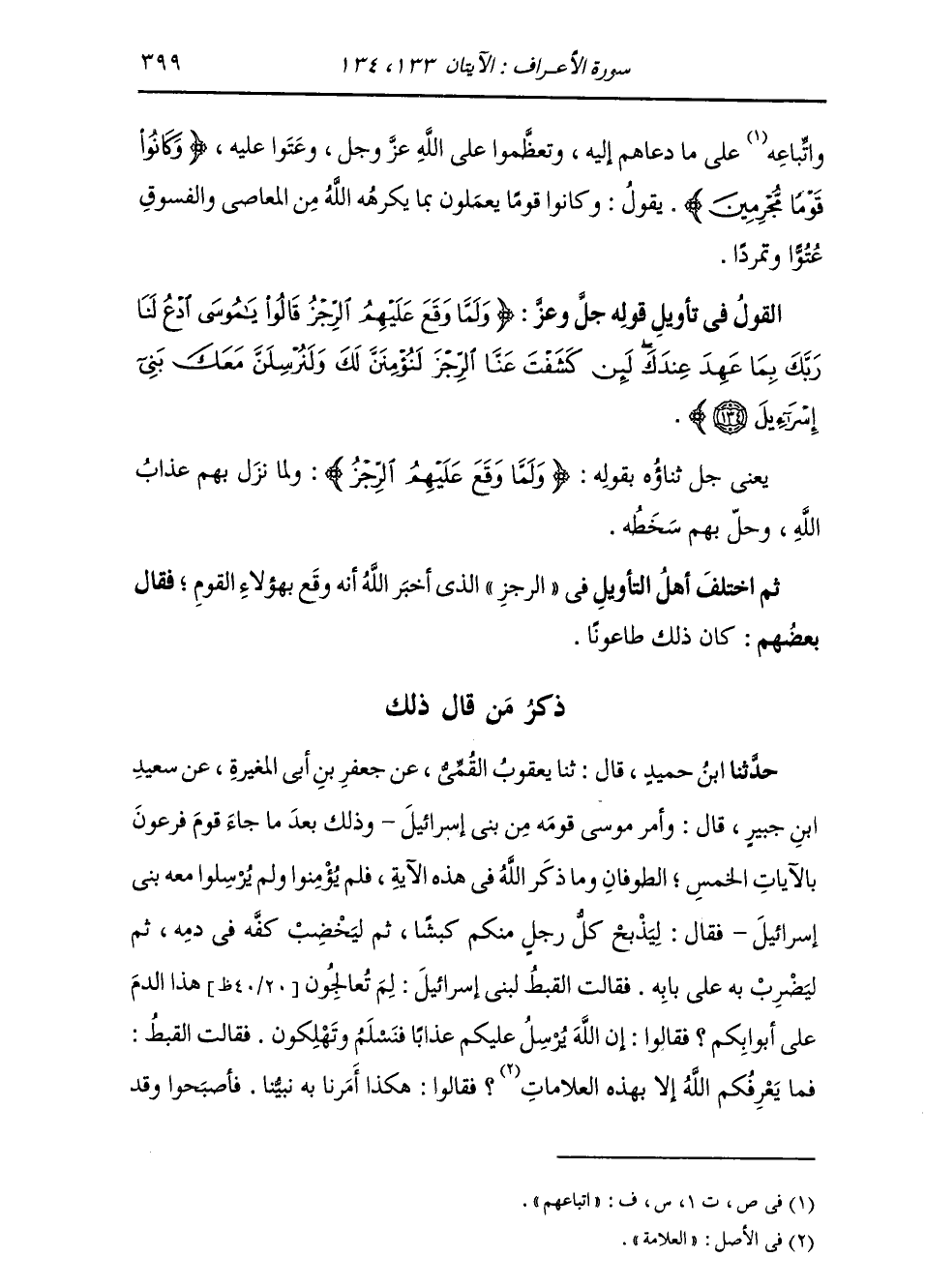 §الْقَوْلُ فِي تَأْوِيلِ قَوْلِهِ تَعَالَى: {وَلَمَّا وَقَعَ عَلَيْهِمُ الرِّجْزُ قَالُوا يَا مُوسَى ادْعُ لَنَا رَبَّكَ بِمَا عَهِدَ عِنْدَكَ لَئِنْ كَشَفْتَ عَنَّا الرِّجْزَ لَنُؤْمِنَنَّ لَكَ وَلَنُرْسِلَنَّ مَعَكَ بَنِي إِسْرَائِيلَ} [الأعراف: 134] يَقُولُ تَعَالَى ذِكْرُهُ: {وَلَمَّا وَقَعَ عَلَيْهِمُ الرِّجْزُ} [الأعراف: 134] ، وَلَمَّا نَزَلَ بِهِمْ عَذَابُ اللَّهِ، وَحَلَّ بِهِمْ سَخَطُهُ. ثُمَّ اخْتَلَفَ أَهْلُ التَّأْوِيلِ فِي ذَلِكَ الرِّجْزِ الَّذِي أَخْبَرَ اللَّهُ أَنَّهُ وَقَعَ بِهَؤُلَاءِ الْقَوْمِ، فَقَالَ بَعْضُهُمْ: كَانَ ذَلِكَ طَاعُونًا. ذِكْرُ مَنْ قَالَ ذَلِكَ