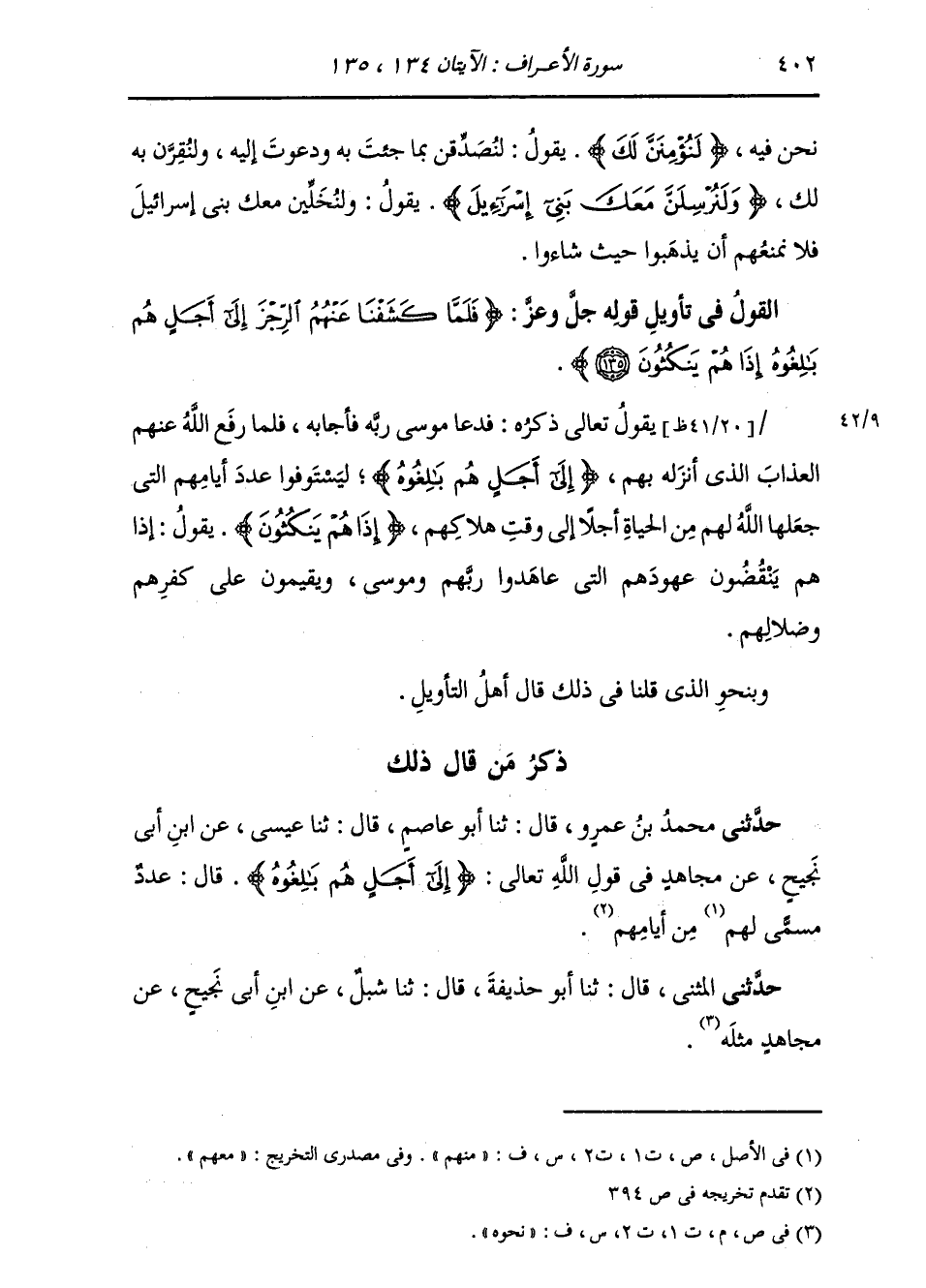 حَدَّثَنِي مُحَمَّدُ بْنُ عَمْرٍو، قَالَ: ثنا أَبُو عَاصِمٍ، قَالَ: ثنا عِيسَى، عَنِ ابْنِ أَبِي نَجِيحٍ، عَنْ مُجَاهِدٍ، فِي قَوْلِ اللَّهِ تَعَالَى: " {§إِلَى أَجَلٍ هُمْ بَالِغُوهُ} [الأعراف: 135] قَالَ: عَدَدٍ مُسَمًّى لَهُمْ مِنْ أَيَّامِهِمْ " حَدَّثَنِي الْمُثَنَّى، قَالَ: ثنا أَبُو حُذَيْفَةَ، قَالَ: ثنا شِبْلٌ، عَنِ ابْنِ أَبِي نَجِيحٍ، عَنْ مُجَاهِدٍ، نَحْوَهُ