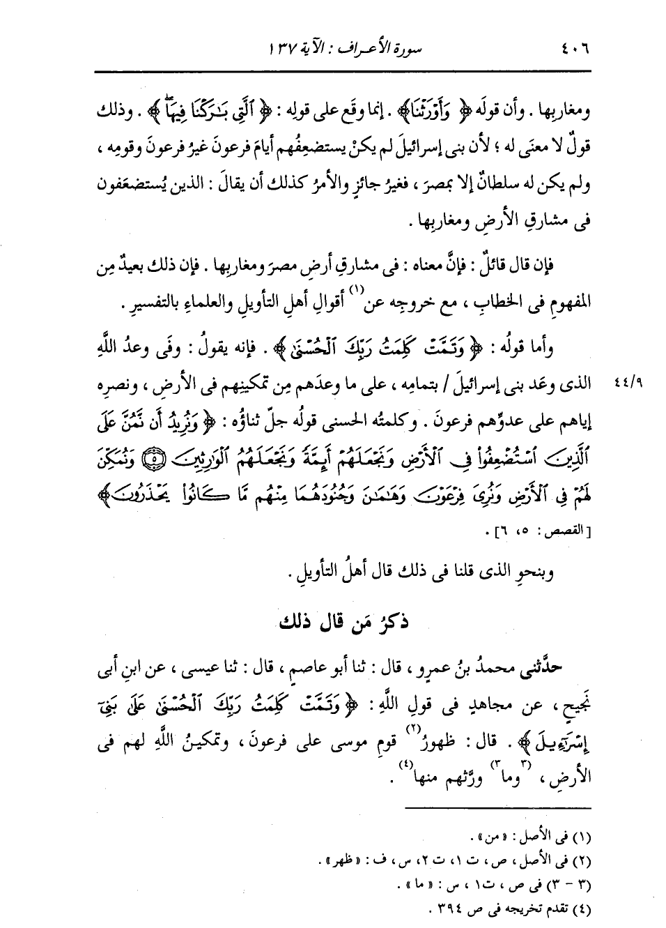 حَدَّثَنَا مُحَمَّدُ بْنُ عَمْرٍو، قَالَ: ثنا أَبُو عَاصِمٍ، قَالَ: ثنا عِيسَى، عَنِ ابْنِ أَبِي نَجِيحٍ، عَنْ مُجَاهِدٍ، فِي قَوْلِ اللَّهِ: " {§وَتَمَّتْ كَلِمَةُ رَبِّكَ الْحُسْنَى عَلَى بَنِي إِسْرَائِيلَ} قَالَ: ظُهُورُ قَوْمِ مُوسَى عَلَى فِرْعَوْنَ، وَتَمْكِينُ اللَّهِ لَهُمْ فِي الْأَرْضِ، وَمَا وَرَّثَهُمْ مِنْهَا " -[407]- حَدَّثَنِي الْمُثَنَّى، قَالَ: ثنا أَبُو حُذَيْفَةَ، قَالَ: ثنا شِبْلٌ، عَنِ ابْنِ أَبِي نَجِيحٍ، عَنْ مُجَاهِدٍ بِنَحْوِهِ