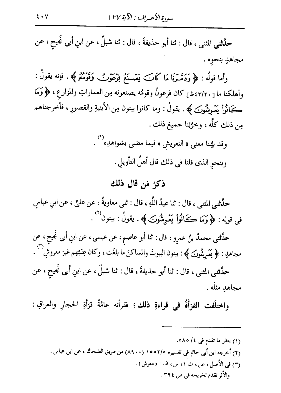 حَدَّثَنِي مُحَمَّدُ بْنُ عَمْرٍو، قَالَ: ثنا أَبُو عَاصِمٍ، عَنْ عِيسَى، عَنِ ابْنِ أَبِي نَجِيحٍ، عَنْ مُجَاهِدٍ: " {§يَعْرِشُونَ} [الأعراف: 137] يَبْنُونَ الْبُيُوتَ وَالْمَسَاكِنَ مَا بَلَغَتْ، وَكَانَ عِنَبُهُمْ غَيْرَ مَعْرُوشٍ " حَدَّثَنِي الْمُثَنَّى، قَالَ: ثنا أَبُو حُذَيْفَةَ، قَالَ: ثنا شِبْلٌ، عَنِ ابْنِ أَبِي نَجِيحٍ، عَنْ مُجَاهِدٍ، مِثْلَهُ. وَاخْتَلَفَتِ الْقُرَّاءُ فِي قِرَاءَةِ ذَلِكَ، فَقَرَأَتْهُ عَامَّةُ قُرَّاءِ الْحِجَازِ وَالْعِرَاقِ -[408]- {يَعْرِشُونَ} [الأعراف: 137] بِكَسْرِ الرَّاءِ، سِوَى عَاصِمِ بْنِ أَبِي النَّجُودِ، فَإِنَّهُ قَرَأَهُ بِضَمِّهَا. وَهُمَا لُغَتَانِ مَشْهُورَتَانِ فِي الْعَرَبِ، يُقَالُ: عَرَشَ يَعْرِشُ وَيَعْرُشُ، فَإِذَا كَانَ ذَلِكَ كَذَلِكَ، فَبِأَيَّتِهِمَا قَرَأَ الْقَارِئُ فَمُصِيبٌ لِاتِّفَاقِ مَعْنَى ذَلِكَ، وَأَنَّهُمَا مَعْرُوفَانِ مِنْ كَلَامِ الْعَرَبِ، وَكَذَلِكَ تَفْعَلُ الْعَرَبُ فِي فِعْلٍ إِذَا رَدَّتْهُ إِلَى الِاسْتِقْبَالِ، تَضُمُّ الْعَيْنَ مِنْهُ أَحْيَانًا، وَتَكْسِرُهُ أَحْيَانًا. غَيْرَ أَنَّ أَحَبَّ الْقِرَاءَتَيْنِ إِلَيَّ كَسْرُ الرَّاءِ لِشُهْرَتِهَا فِي الْعَامَّةِ وَكَثْرَةِ الْقِرَاءَةِ بِهَا وَأَنَّهَا أَصَحُّ اللُّغَتَيْنِ