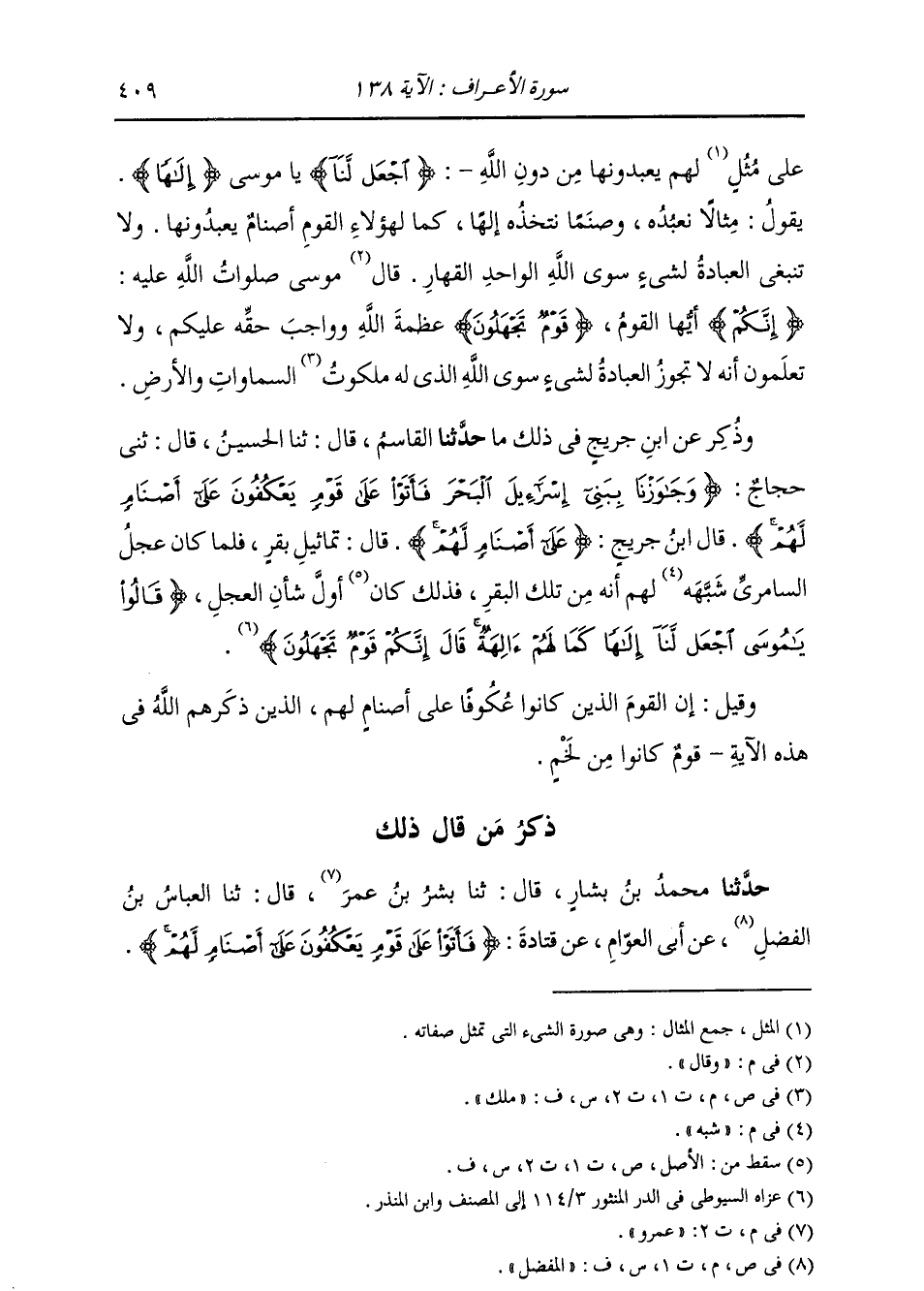 حَدَّثَنَا مُحَمَّدُ بْنُ بَشَّارٍ، قَالَ: ثنا بِشْرُ بْنُ عَمْرٍو، قَالَ: ثنا الْعَبَّاسُ بْنُ الْمُفَضَّلِ، عَنْ أَبِي الْعَوَّامِ، عَنْ قَتَادَةَ: " {§فَأَتَوْا عَلَى قَوْمٍ يَعْكُفُونَ عَلَى أَصْنَامٍ لَهُمْ} [الأعراف: 138]-[410]- قَالَ: عَلَى لَخْمٍ، وَقِيلَ: إِنَّهُمْ كَانُوا مِنَ الْكَنْعَانِيِّينَ الَّذِينَ أُمِرَ مُوسَى عَلَيْهِ السَّلَامُ بِقِتَالِهِمْ "