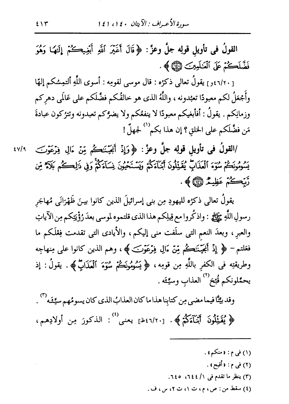 §الْقَوْلُ فِي تَأْوِيلِ قَوْلِهِ تَعَالَى: {وَإِذْ أَنْجَيْنَاكُمْ مِنْ آلِ فِرْعَوْنَ} [الأعراف: 141] يَقُولُ تَعَالَى ذِكْرُهُ لِلْيَهُودِ مِنْ بَنِي إِسْرَائِيلَ الَّذِينَ كَانُوا بَيْنَ ظَهْرَانَيْ مُهَاجَرِ رَسُولِ اللَّهِ صَلَّى اللهُ عَلَيْهِ وَسَلَّمَ: وَاذْكُرُوا مَعَ قِيلِكُمْ هَذَا الَّذِي قُلْتُمُوهُ لِمُوسَى بَعْدَ رُؤْيَتِكُمْ مِنَ الْآيَاتِ وَالْعِبَرِ، وَبَعْدَ النِّعَمِ الَّتِي سَلَفَتْ مِنِّي إِلَيْكُمْ، وَالْأَيَادِي الَّتِي تَقَدَّمَتْ فِعْلَكُمْ مَا فَعَلْتُمْ. {إِذْ أَنْجَيْنَاكُمْ مِنْ آلِ فِرْعَوْنَ} [الأعراف: 141] وَهُمُ الَّذِينَ كَانُوا عَلَى مِنْهَاجِهِ وَطَرِيقَتِهِ فِي الْكُفْرِ بِاللَّهِ مِنْ قَوْمِهِ. {يَسُومُونَكُمْ سُوءَ الْعَذَابِ} [البقرة: 49] يَقُولُ: إِذْ يَحْمِلُونَكُمْ أَقْبَحَ الْعَذَابِ وَسَيِّئَهُ. وَقَدْ بَيَّنَّا فِيمَا مَضَى مِنْ كِتَابِنَا هَذَا مَا كَانَ الْعَذَابُ الَّذِي كَانَ يَسُومُهُمْ سَيِّئَهُ. {يُقَتِّلُونَ أَبْنَاءَكُمْ} [الأعراف: 141] الذُّكُورَ مِنْ أَوْلَادِهِمْ