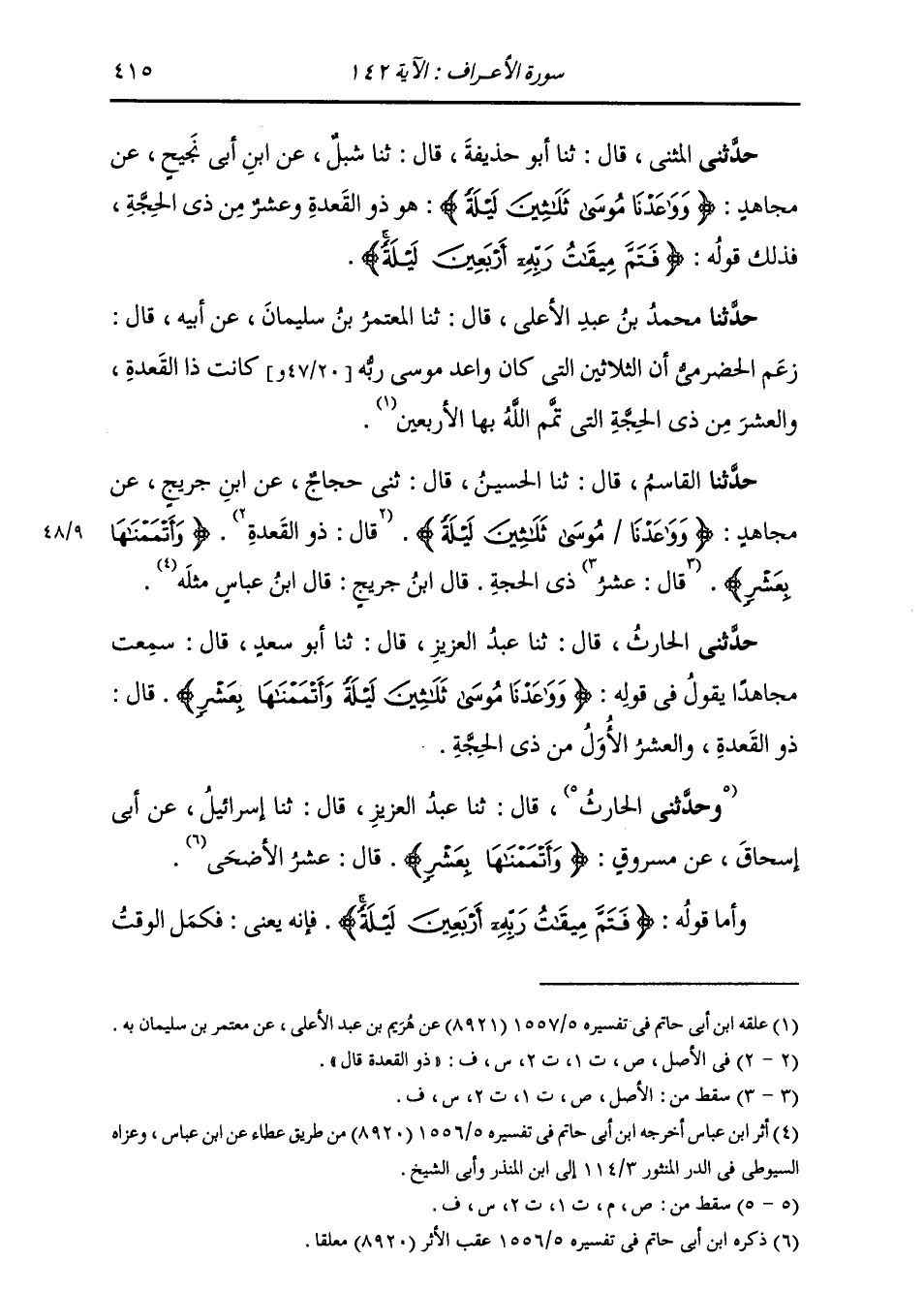 حَدَّثَنِي الْمُثَنَّى، قَالَ: ثنا أَبُو حُذَيْفَةَ، قَالَ: ثنا شِبْلٌ، عَنِ ابْنِ أَبِي نَجِيحٍ، عَنْ مُجَاهِدٍ: " {§وَوَاعَدْنَا مُوسَى ثَلَاثِينَ لَيْلَةً} [الأعراف: 142] هُوَ ذُو الْقَعْدَةِ وَعَشْرٌ مِنْ ذِي الْحِجَّةِ، فَذَلِكَ قَوْلُهُ: {فَتَمَّ مِيقَاتُ رَبِّهِ أَرْبَعِينَ لَيْلَةً} [الأعراف: 142] "