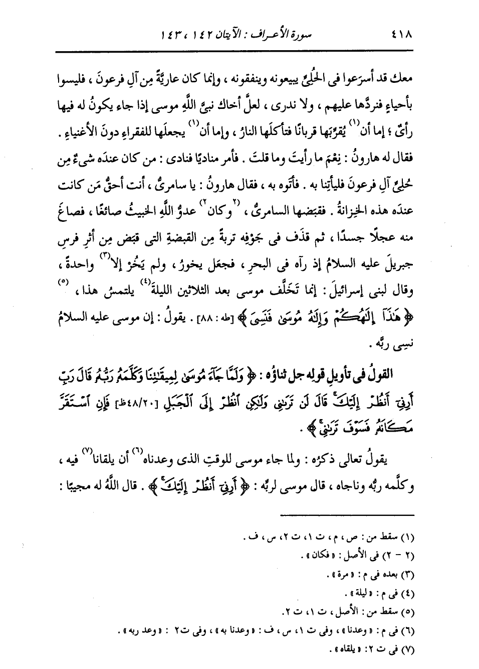§الْقَوْلُ فِي تَأْوِيلِ قَوْلِهِ تَعَالَى: {وَلَمَّا جَاءَ مُوسَى لِمِيقَاتِنَا وَكَلَّمَهُ رَبُّهُ قَالَ رَبِّ أَرِنِي أَنْظُرْ إِلَيْكَ قَالَ لَنْ تَرَانِي وَلَكِنِ انْظُرْ إِلَى الْجَبَلِ فَإِنِ اسْتَقَرَّ مَكَانَهُ فَسَوْفَ تَرَانِي فَلَمَّا تَجَلَّى رَبُّهُ لِلْجَبَلِ جَعَلَهُ دَكًّا وَخَرَّ مُوسَى صَعِقًا فَلَمَّا أَفَاقَ قَالَ سُبْحَانَكَ تُبْتُ إِلَيْكَ وَأَنَا أَوَّلُ الْمُؤْمِنِينَ} [الأعراف: 143] يَقُولُ تَعَالَى ذِكْرُهُ: وَلَمَّا جَاءَ مُوسَى لِلْوَقْتِ الَّذِي وَعَدَنَا أَنْ يَلْقَانَا فِيهِ، وَكَلَّمَهُ رَبُّهُ وَنَاجَاهُ، قَالَ مُوسَى لِرَبِّهِ: {أَرِنِي أَنْظُرْ إِلَيْكَ} [الأعراف: 143] قَالَ اللَّهُ لَهُ مُجِيبًا -[419]-: {لَنْ تَرَانِي وَلَكِنِ انْظُرْ إِلَى الْجَبَلِ} [الأعراف: 143] وَكَانَ سَبَبُ مَسْأَلَةِ مُوسَى رَبَّهُ النَّظَرَ إِلَيْهِ مَا