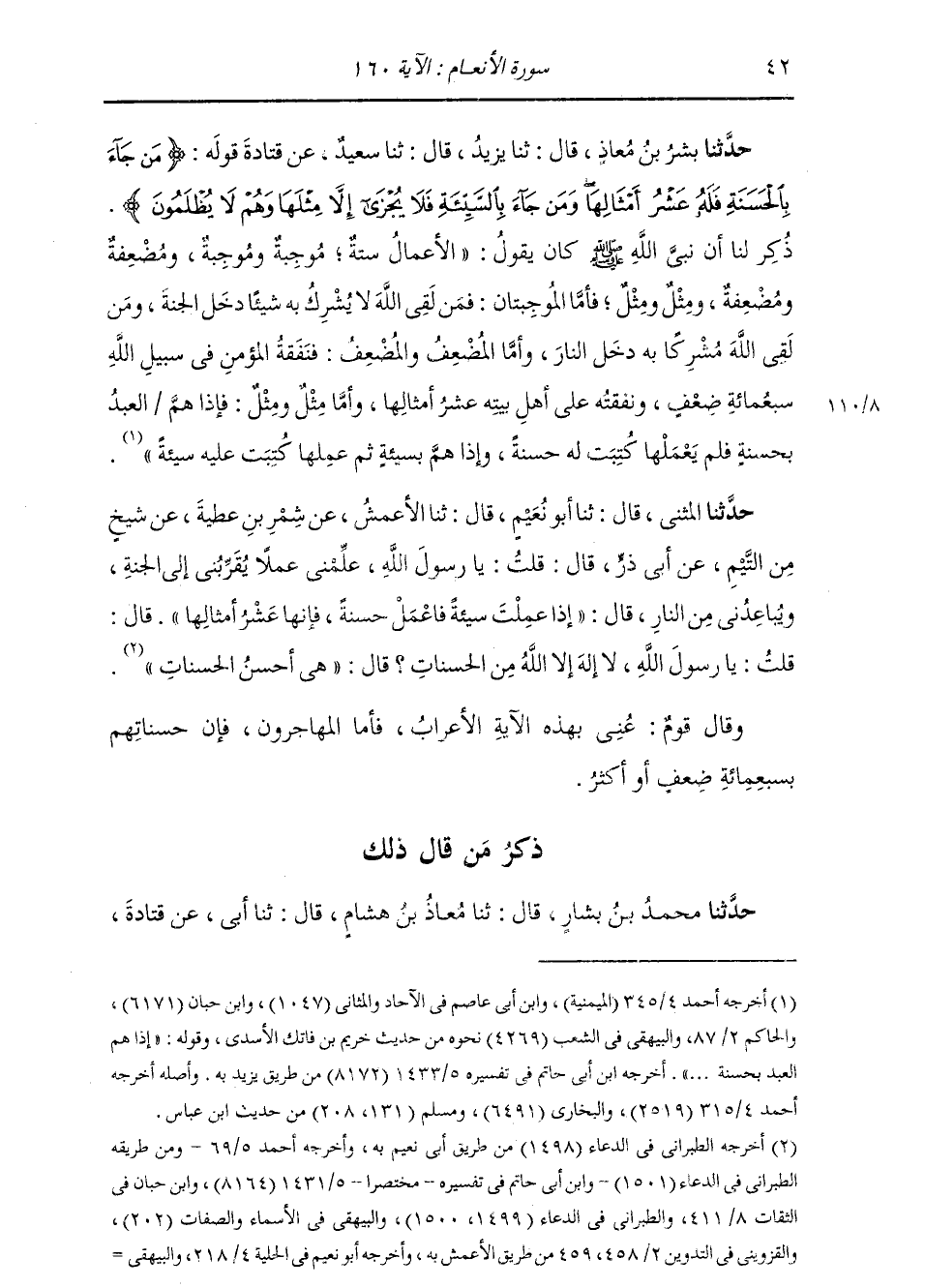 حَدَّثَنَا بِشْرُ بْنُ مُعَاذٍ، قَالَ: ثنا يَزِيدُ، قَالَ: ثنا سَعِيدٌ، عَنْ قَتَادَةَ، قَوْلُهُ: {مَنْ جَاءَ بِالْحَسَنَةِ فَلَهُ عَشْرُ أَمْثَالِهَا وَمَنْ جَاءَ بِالسَّيِّئَةِ فَلَا يُجْزَى إِلَّا مِثْلَهَا وَهُمْ لَا يُظْلَمُونَ} [الأنعام: 160] : ذُكِرَ لَنَا أَنَّ نَبِيَّ اللَّهِ صَلَّى اللهُ عَلَيْهِ وَسَلَّمَ كَانَ يَقُولُ: " §الْأَعْمَالُ سِتَّةٌ: مُوجِبَةٌ وَمُوجِبَةٌ، وَمُضَعِّفَةٌ وَمُضَعِّفَةٌ، وَمِثْلٌ وَمِثْلٌ. فَأَمَّا الْمُوجِبَتَانِ: فَمَنْ لَقِيَ اللَّهَ لَا يُشْرِكُ بِهِ شَيْئًا دَخَلَ الْجَنَّةَ، وَمَنْ لَقِيَ اللَّهَ مُشْرِكًا بِهِ دَخَلَ النَّارَ، وَأَمَّا الْمُضَعِّفُ وَالْمُضَعِّفُ: فَنَفَقَةُ الْمُؤْمِنِ فِي سَبِيلِ اللَّهِ سَبْعُ مِائَةِ ضِعْفٍ، وَنَفَقَتُهُ عَلَى أَهْلِ بَيْتِهِ عَشْرُ أَمْثَالِهَا. وَأَمَّا مِثْلٌ وَمِثْلٌ: فَإِذَا هَمَّ الْعَبْدُ بِحَسَنَةٍ فَلَمْ يَعْمَلْهَا كُتِبَتْ لَهُ حَسَنَةً، وَإِذَا هَمَّ بِسَيِّئَةٍ ثُمَّ عَمِلَهَا كُتِبَتْ عَلَيْهِ سَيِّئَةً "